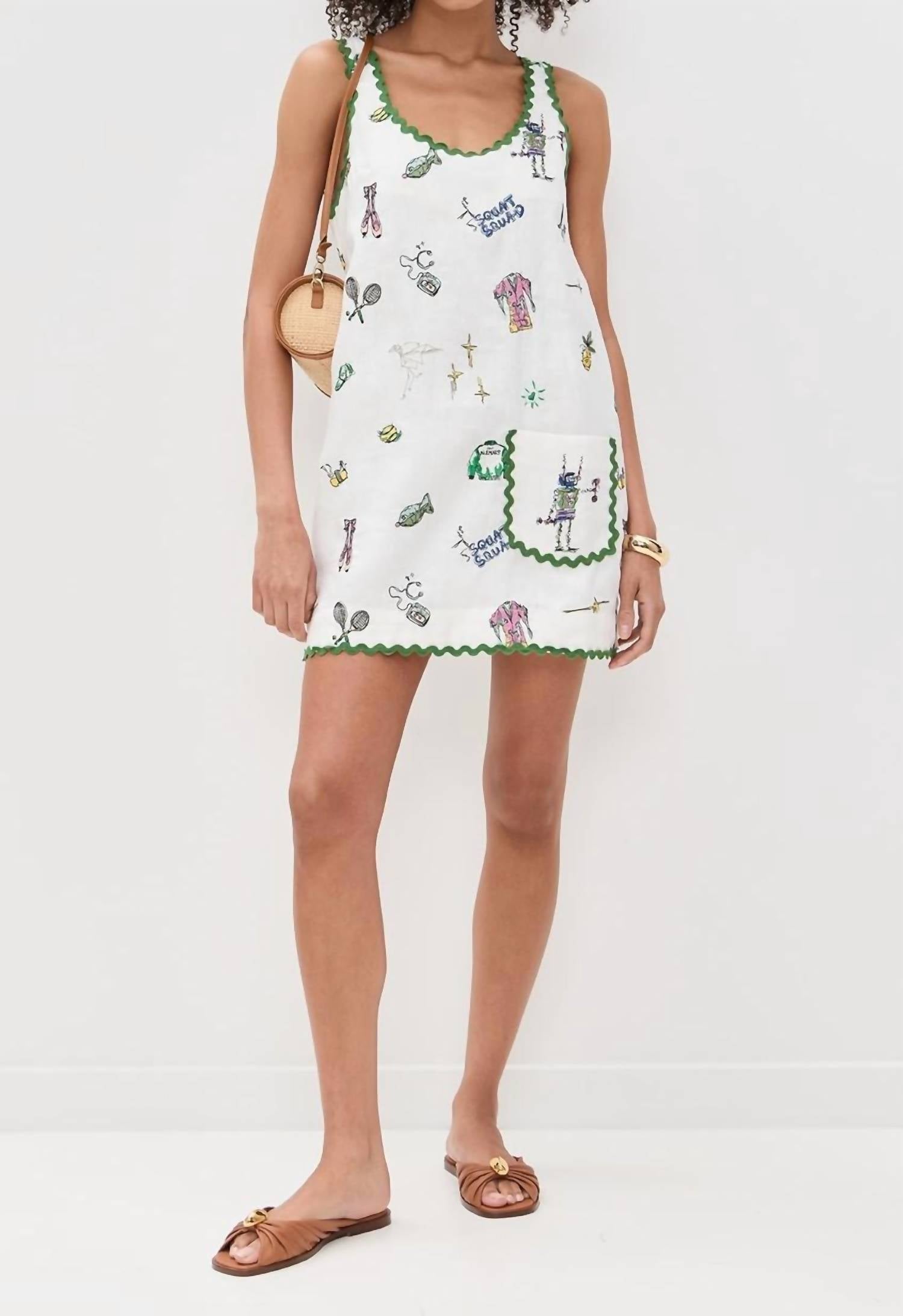 Discover the Play Embroidered Mini Dress by ALEMAIS, a chic summer piece in cream that embodies boho style. This sleeveless shift dress is crafted from 100% linen with a 100% cotton lining, featuring intricate embroidered motifs and rickrack trim. It boasts a mini length of 32.75 inches (83.0 cm) and a scoop neck, complete with a button keyhole closure at the back and a practical patch front pocket. Imported from China, this dress is ideal for vacation occasions and should be dry cleaned to maintain its quality.