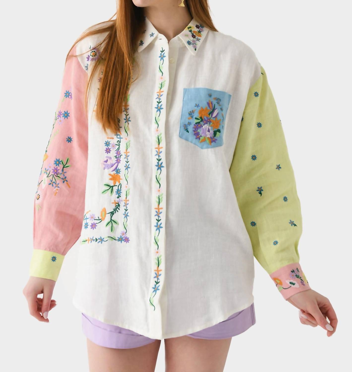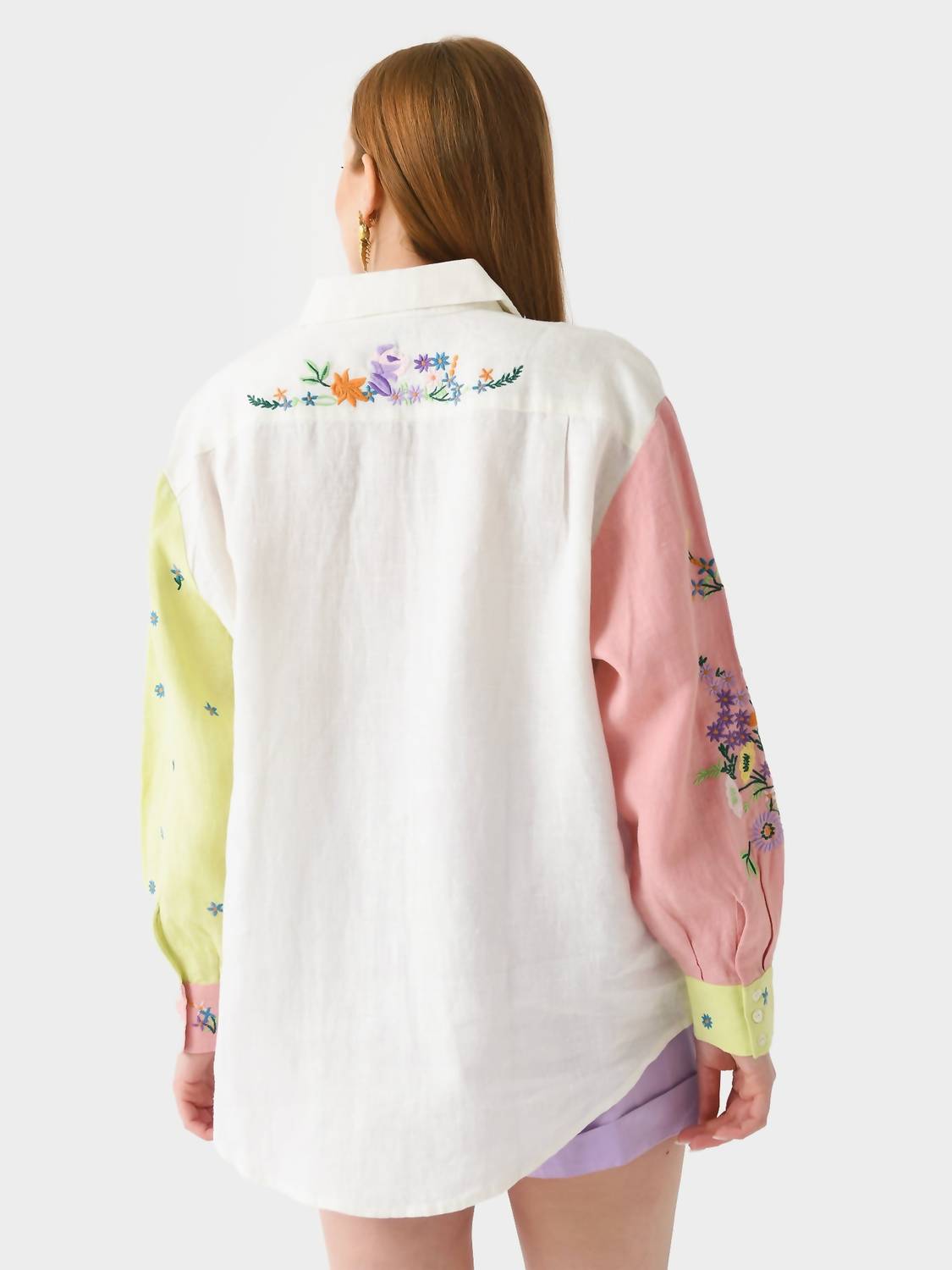 Perfectly tailored and soft to the touch.This lightweight linen button-down shirt features a spread collar, dropped shoulders, a left chest pocket, button cuffs, a hidden button-down placket, a curved hem, and colorful embroidered motifs throughout. It is made of 100% linen with a relaxed fit. The model is wearing a size US 4/AUS 8 shirt, and her measurements are: height 5'9", bust 34B, waist 27", hips 37", and dress size 4 (US).