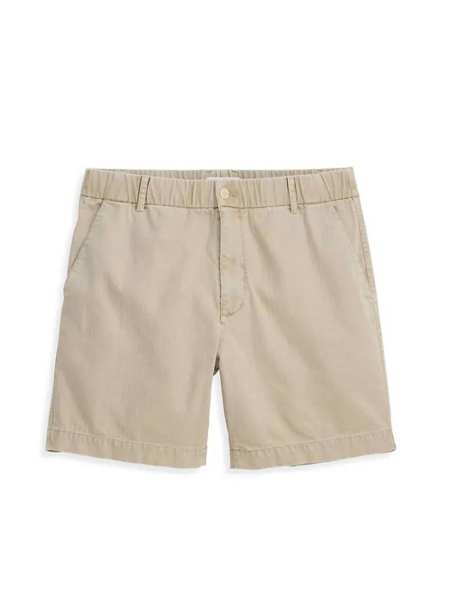 Discover the Herringbone Pull On Short by ALEX MILL, designed with a timeless stoneware hue for minimalist style. These men's flat front shorts feature breathable, mid-weight, non-stretch twill with a composition of 50% recycled cotton and 50% cotton. Crafted with practical slant hip and flap back pockets, they have a covered elastic waist with an interior drawstring and a reliable button closure with a zip fly. This versatile piece is perfect for a summer dinner party, and can be machine washed cold for easy care. Dimensions: 7-inch inseam.