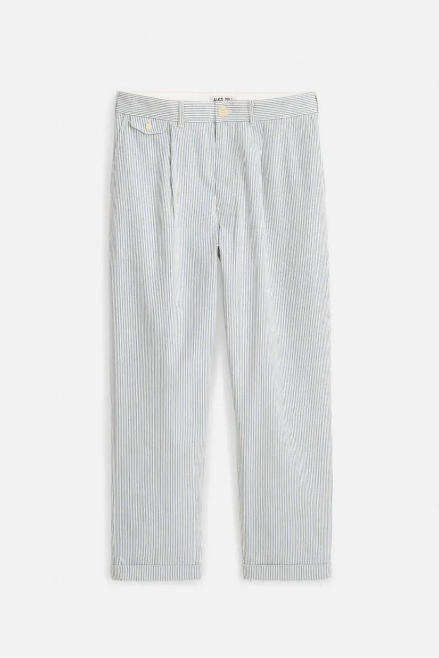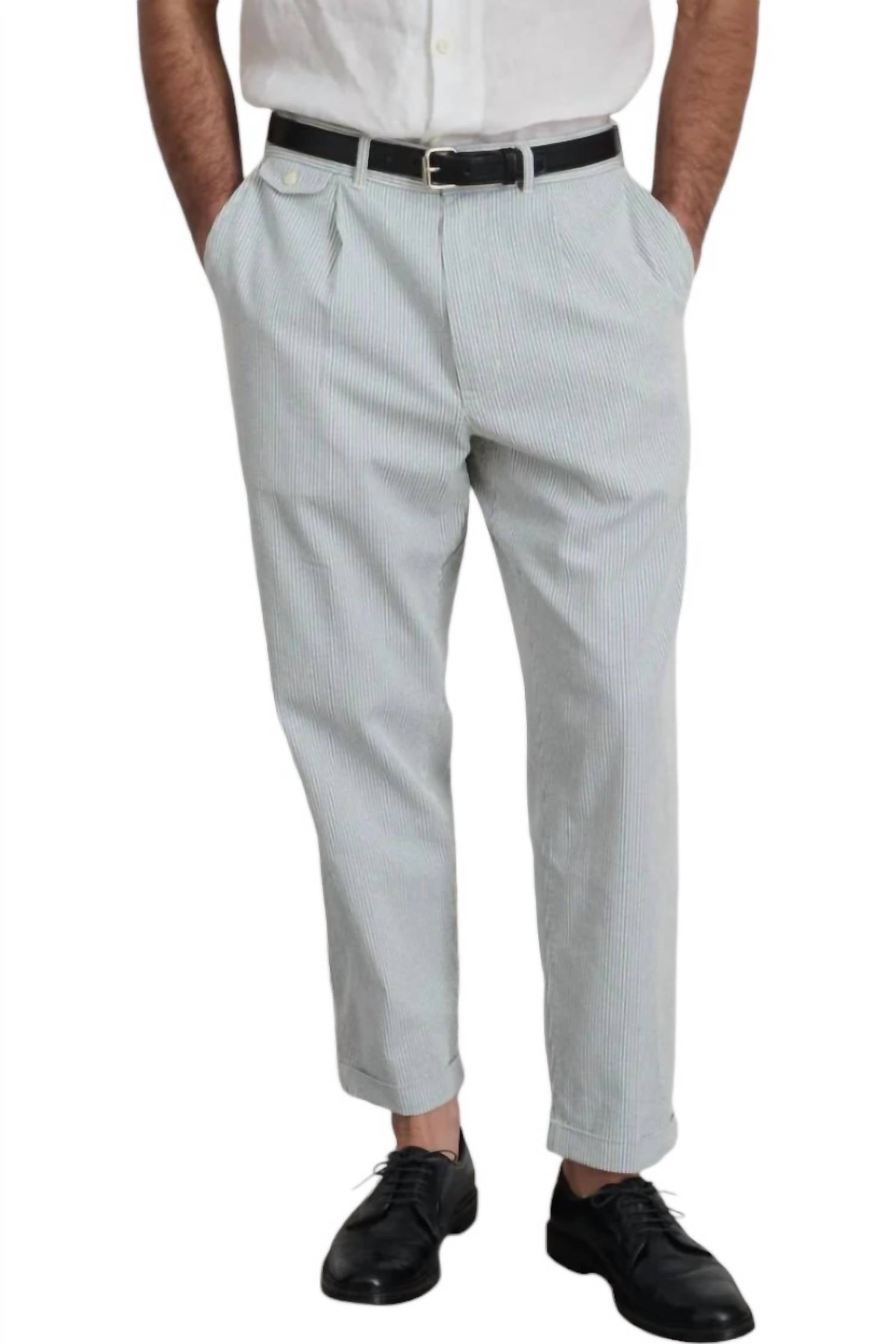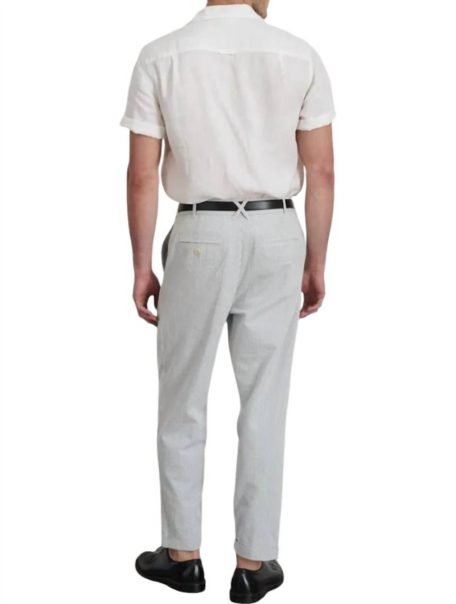 Crafted in lightweight seersucker for breathable elegance. Boast a classic straight leg and a subtle stripe pattern. Delivering both comfort and style for any occasion. Designed for a true-to-size fit. Feature a button closure and practical pockets for everyday convenience. Meticulously constructed. 100% cotton fabric to the precise measurements. Waist circumference of 34.5" and hip of 44". Promise a tailored yet relaxed fit.