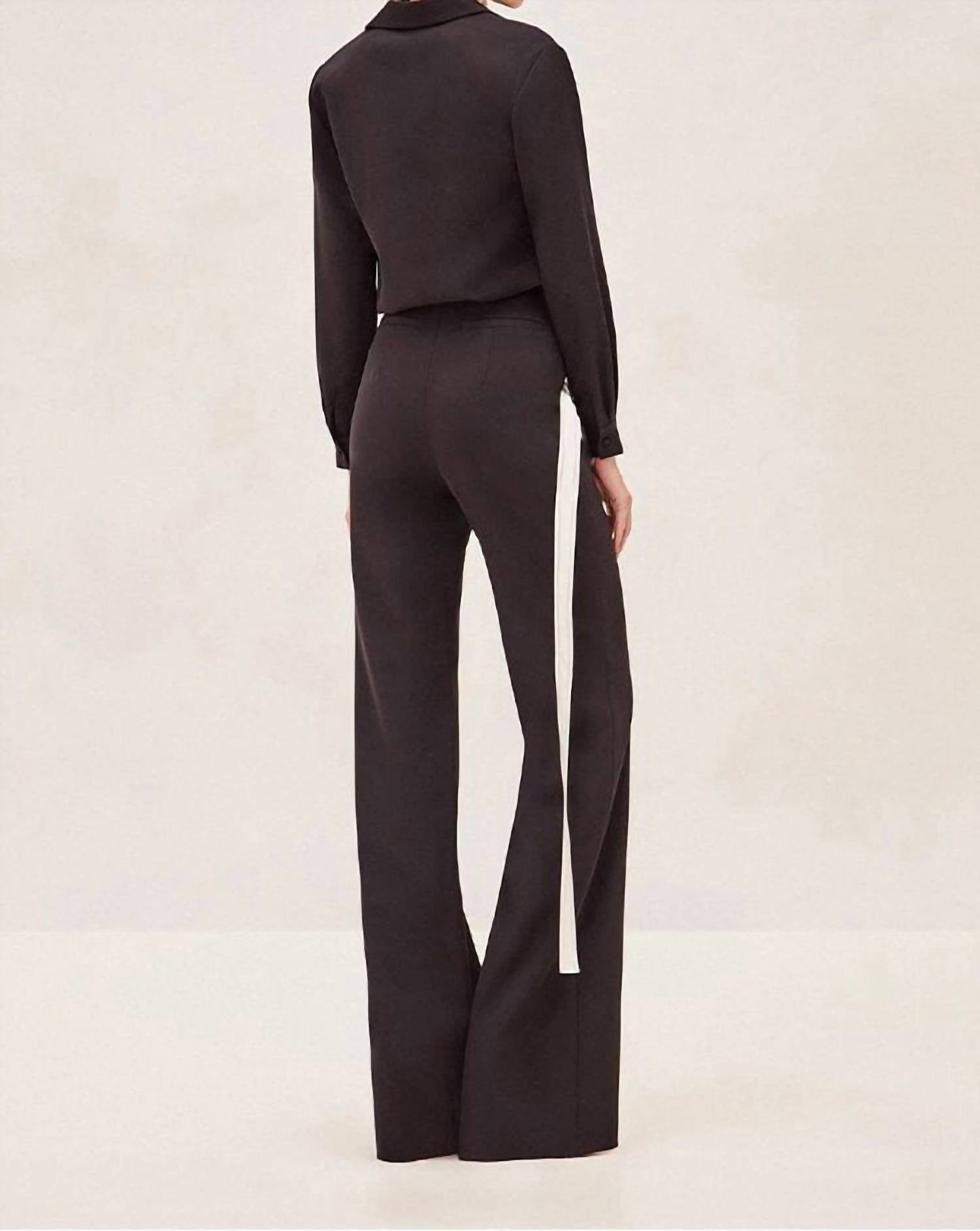 Introducing the Roks Pants by ALEXIS, a statement piece perfect for showcasing quiet luxury in your fall wardrobe. These black wide-leg pants feature a flattering high-rise waist and a slim-fit silhouette, accentuated by a sleek side stripe detail for a modern twist. Designed with pockets for added functionality, they offer versatile styling options for any dinner party occasion. Model is wearing size XS, highlighting the streamlined elegance of this must-have piece.