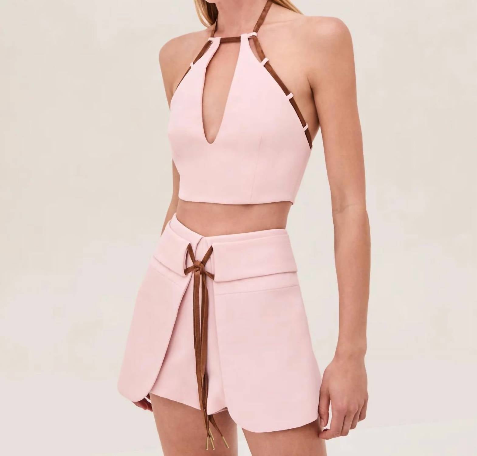 Pair this with your favorite jeans and slides for your next girls night out. The ALEXIS Saya Top is an eye-catching sleeveless piece in solid pink, perfect for festival season. Crafted from polyester with a halter neckline, this crop top features a unique suede frame loop detail and a keyhole accent, enhancing its streetwear appeal. Closure is a discreet zip. Care for this stunning top by dry cleaning only.