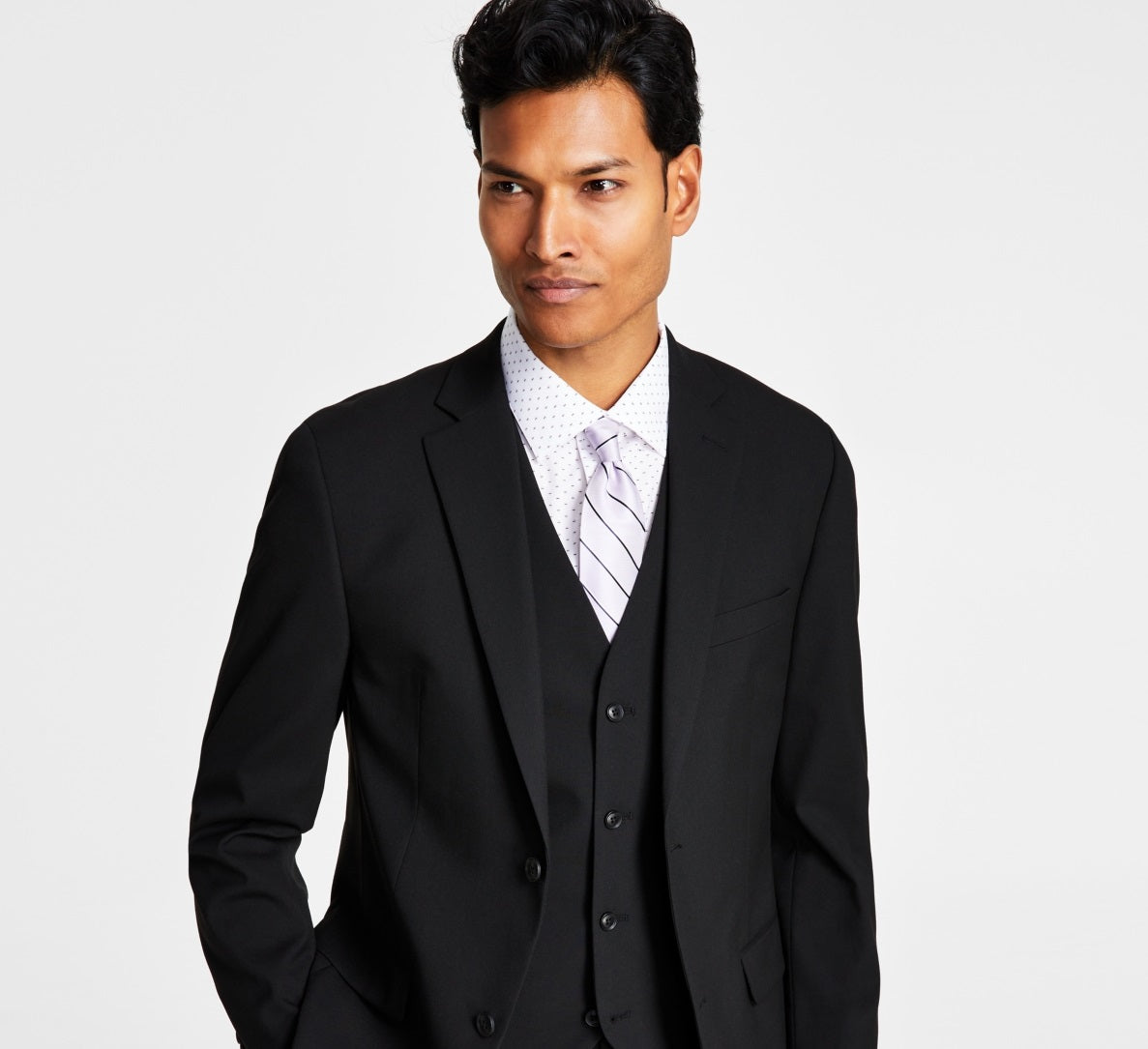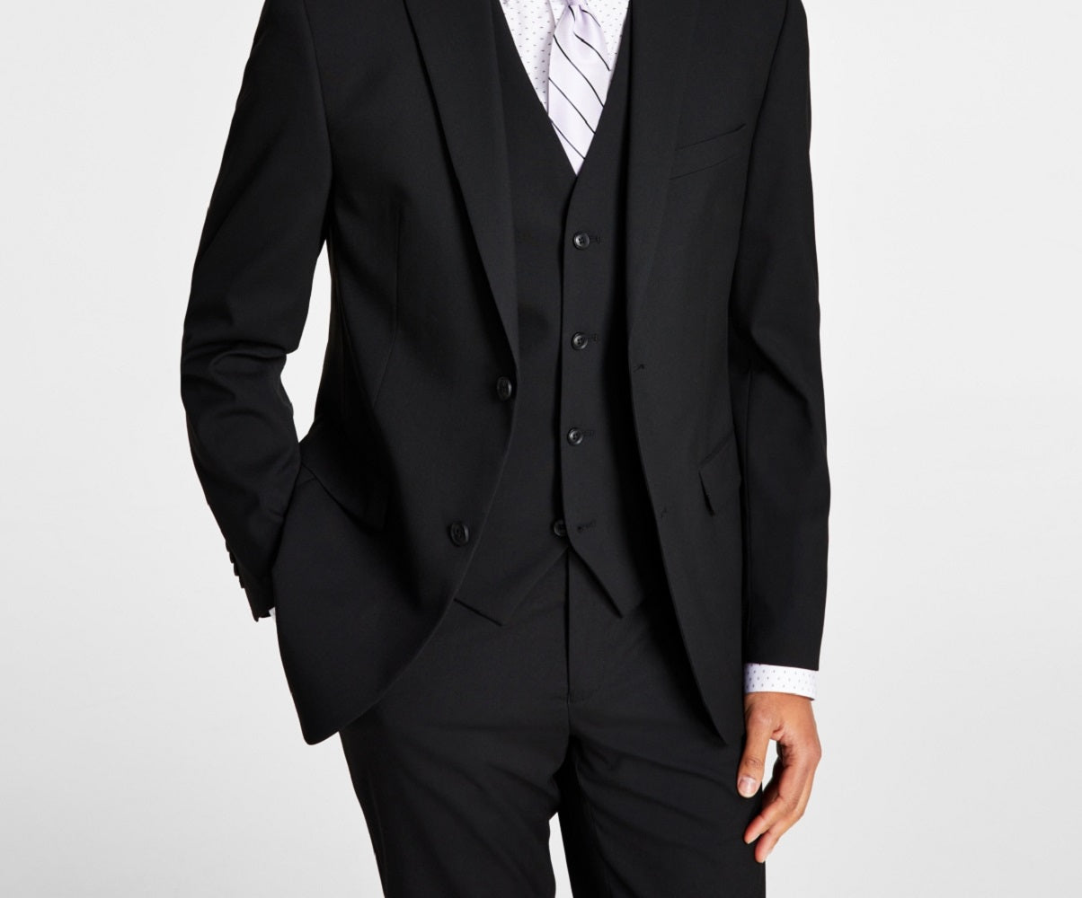 Two-button closure; four-button cuffs|Notched lapel|Imported|Two front flap pockets; left chest welt pocket|Side vents; fully lined; stretch performance|Matching pants and vest sold separately