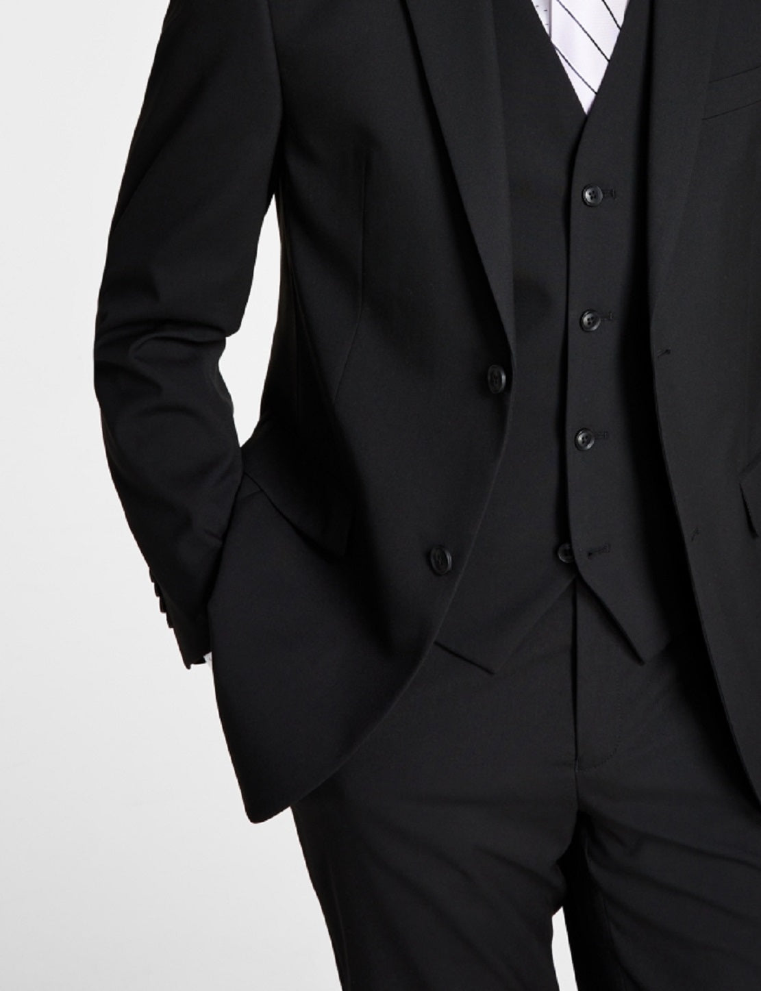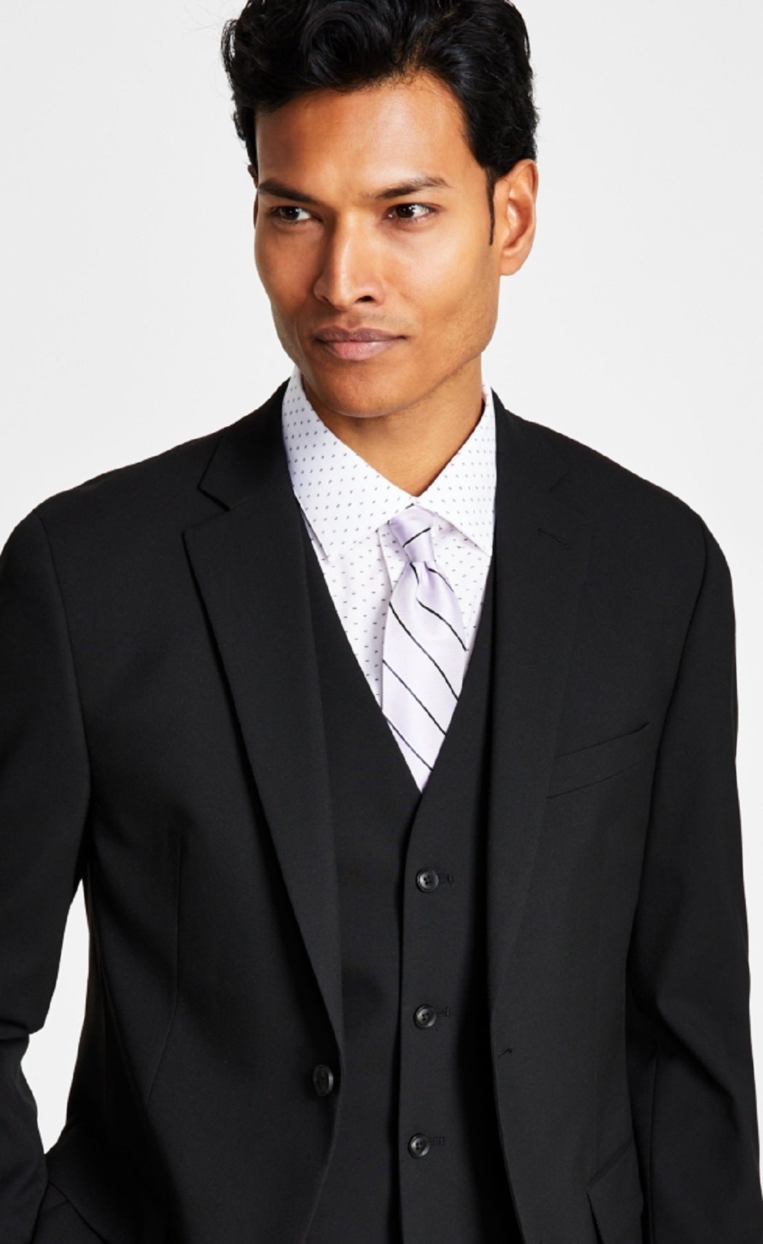 Two-button closure; four-button cuffs|Notched lapel|Imported|Two front flap pockets; left chest welt pocket|Side vents; fully lined; stretch performance|Matching pants and vest sold separately