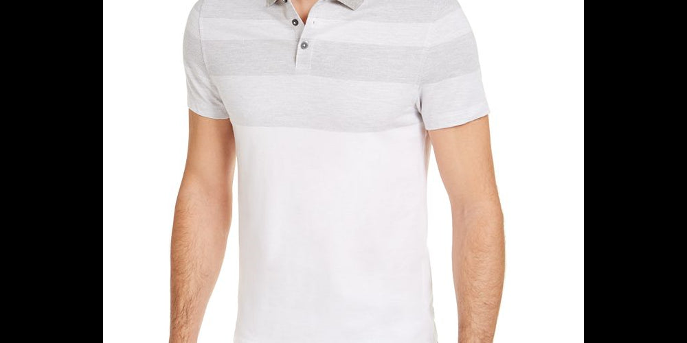 Alfani Mens Two-Toned Blocked Polo 60% Cotton 40% polyester| Machine wash cold with like colors. Only non-chlorine bleach when needed. Tumble dry low. Warm iron when needed. | and he is wearing a size medium| Classic fit| Polo collar; three-button placket|