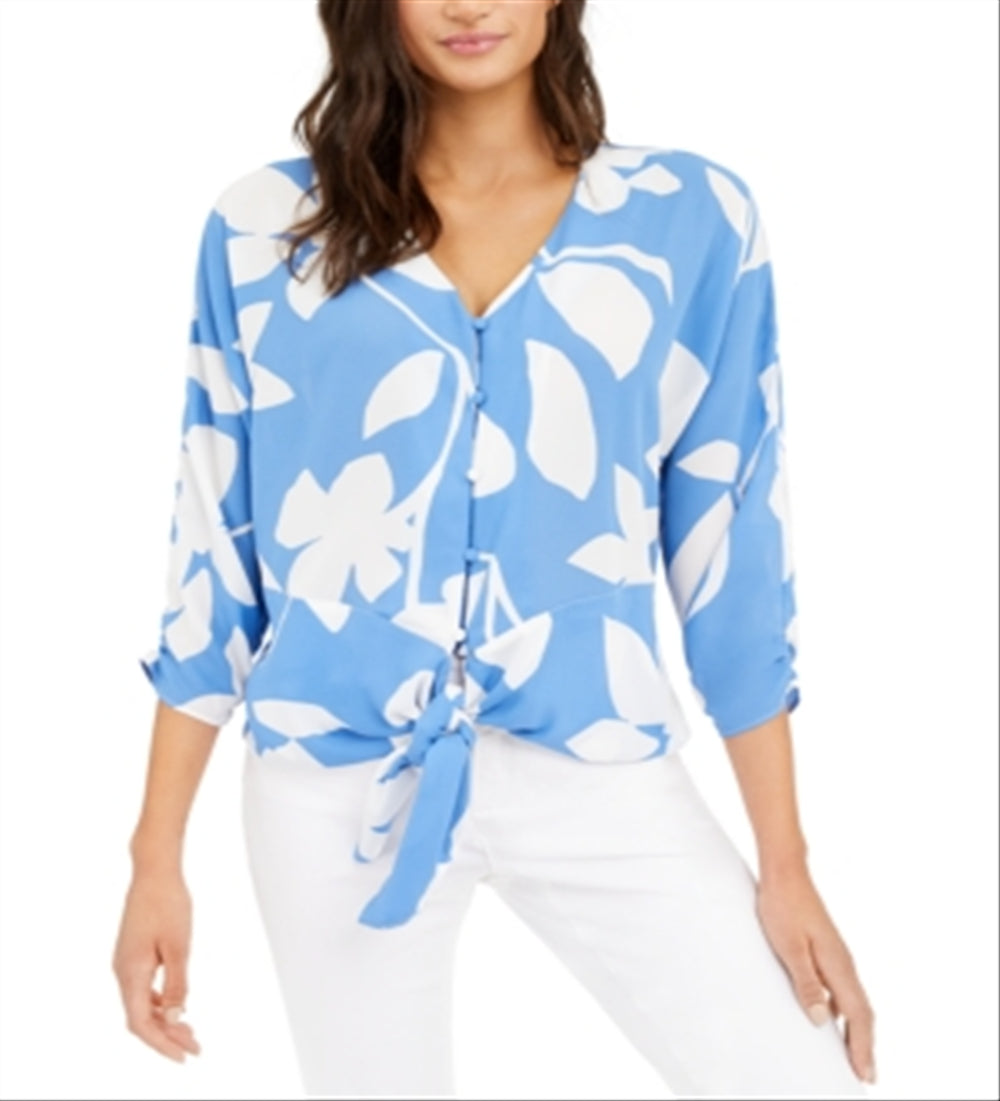 Alfani Printed Tie-Front Blouse Blue Size XXL