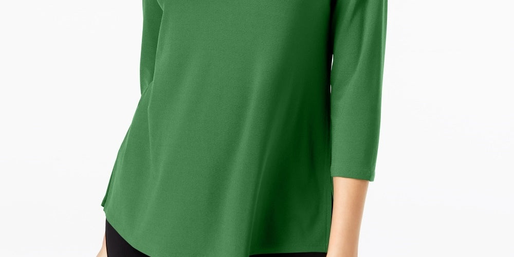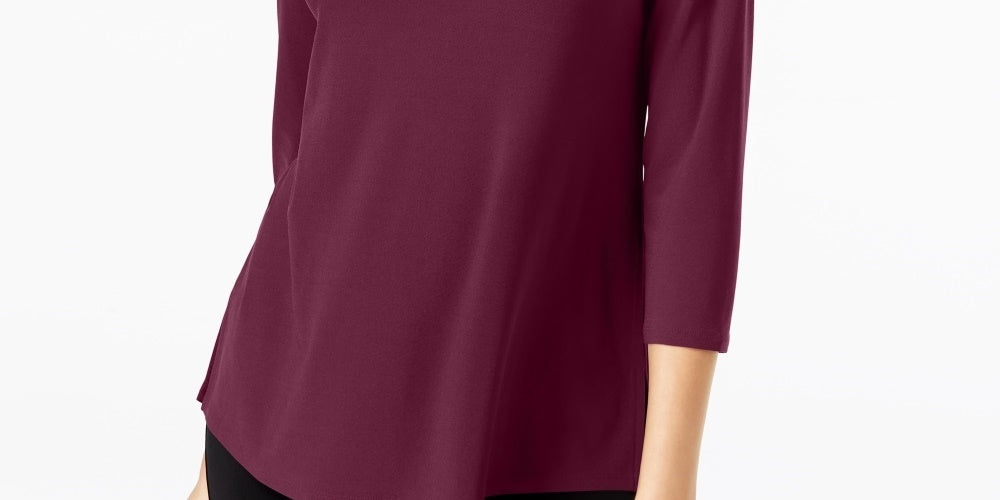 V-neckline with hardware|High-low hem|3/4-sleeves|Hits at hip