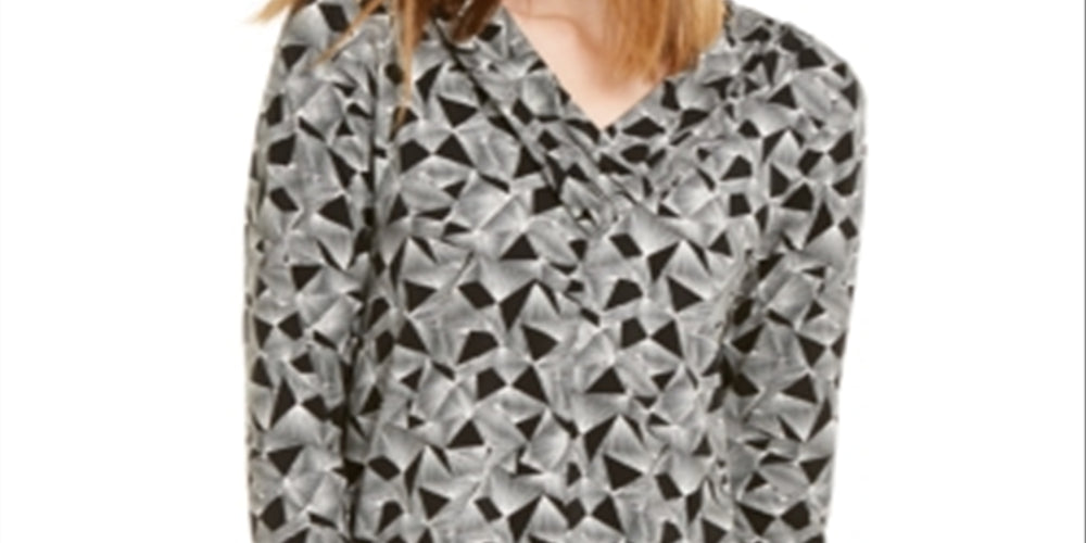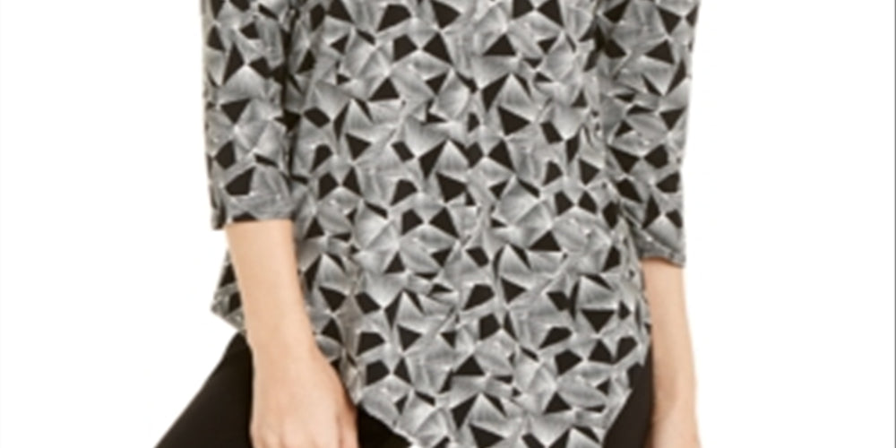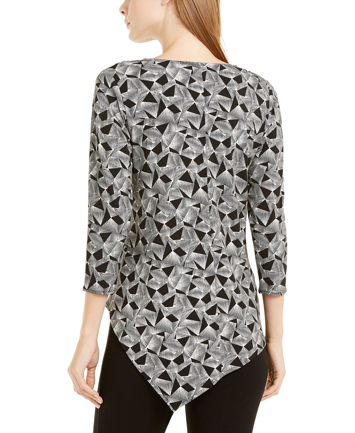 A stunning new look in a sleek contemporary print| this Alfani top features a ruched neckline and asymmetrical hem that update your collection.| Ruched V-neck| Asymmetrical hem| 3/4-sleeves|
