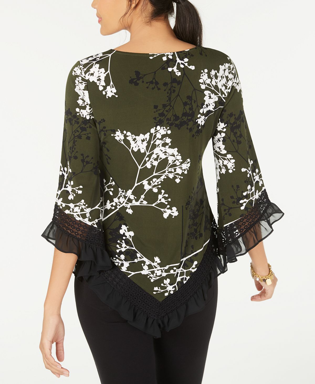 Alfani Women's Floral Print Lace Trim Top Green Size Petite L
