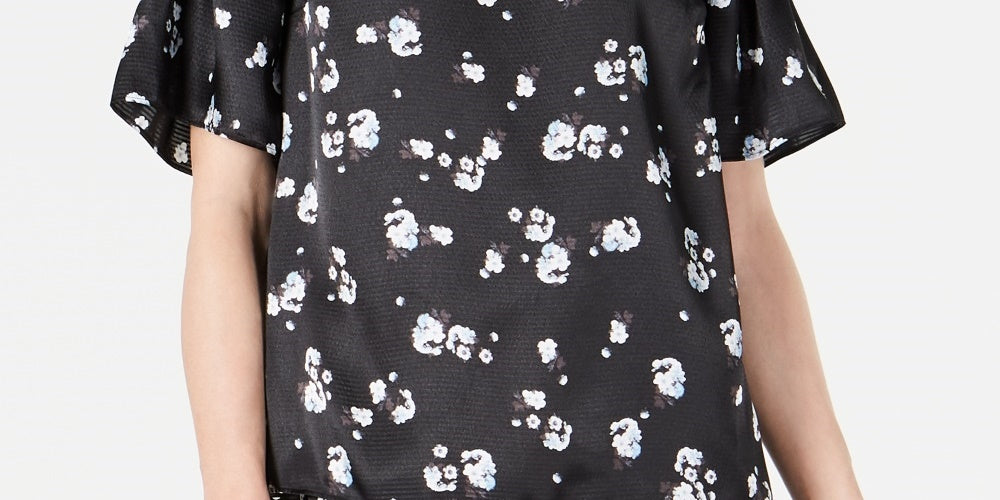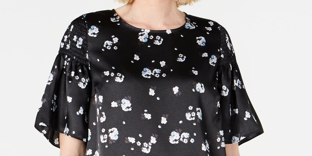 Alfani Women's Floral Print Satin Smocked Shoulder Top Black Size Large