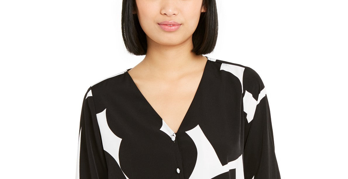 Alfani Women's Heart-Print Gathered-Sleeve Shirt Black Size Small