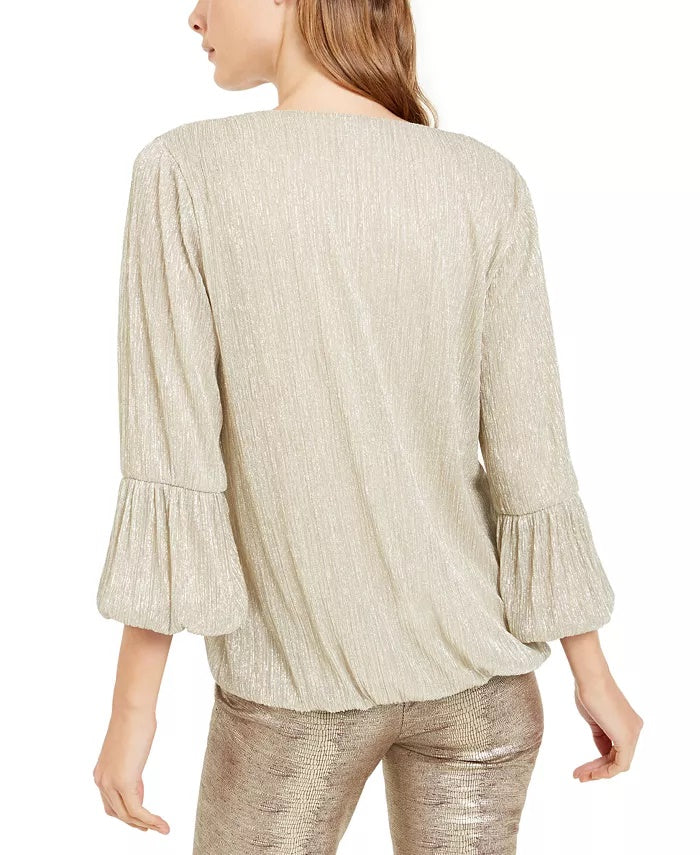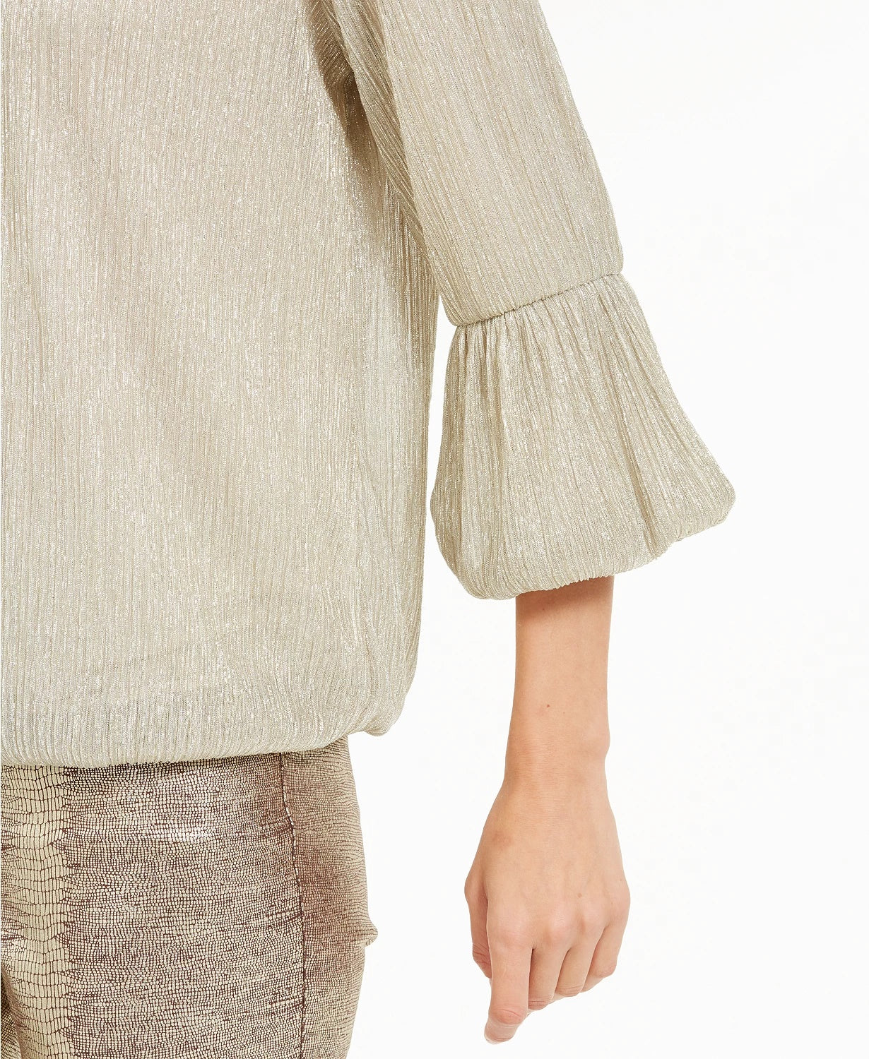 Approx. 22-3/8" long|Designed to fit and flatter 5'4" and under frame|V-neck|Bubble hemline|3/4-sleeves with slightly flared cuffs|Polyester/Lurex® metallic threads; lining: nylon
