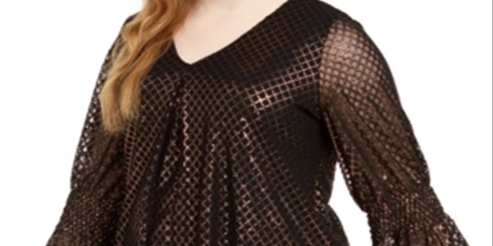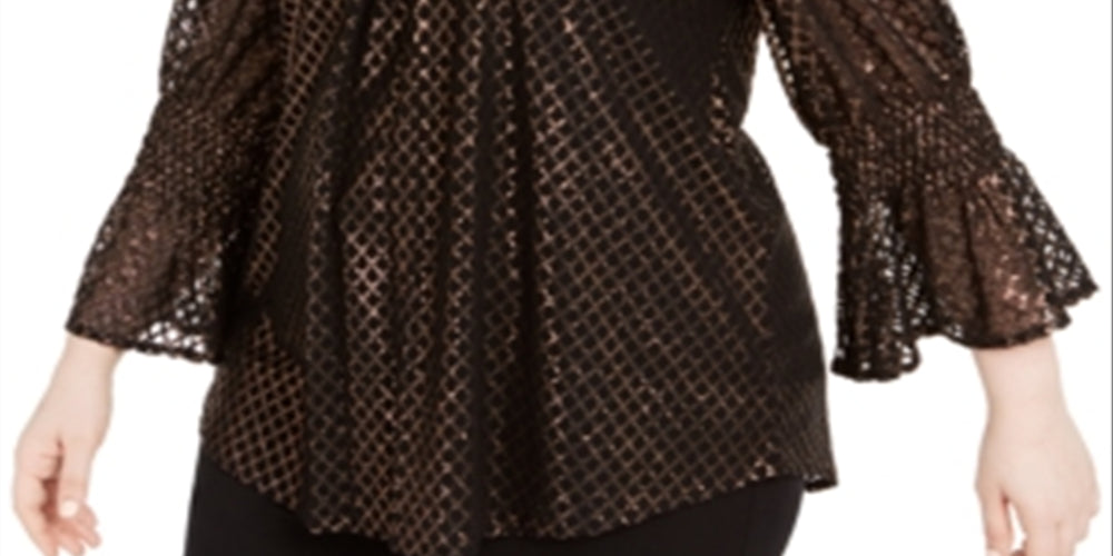 Alfani Women's Metallic Print Bell Sleeve Top Black Size 1X