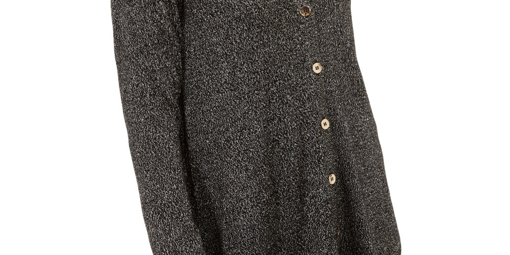 Approx. 25-1/2" long|Designed to fit and flatter 5'4" and under frame|V-neck; button-front closure|Shirttail hemline|Rayon/polyester/Lurex® metallic threads
