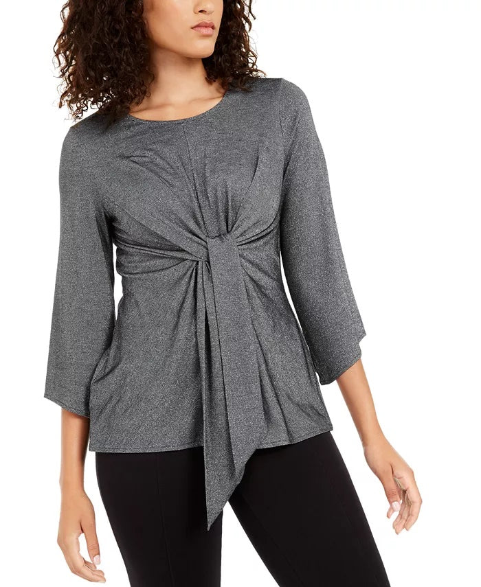 Approx. 25-1/4" long|Scoop neckline|Allover metallic detail; tie at front waist|3/4-sleeves