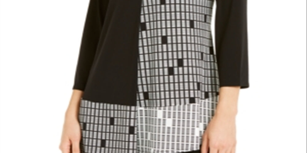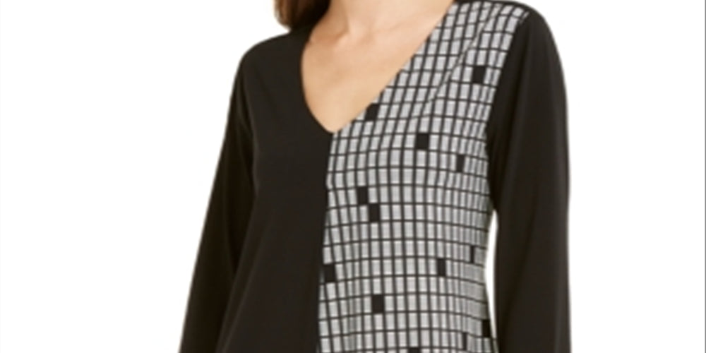 Alfani Women's Patterned 3/4 Sleeve V Neck Top Black Size Large