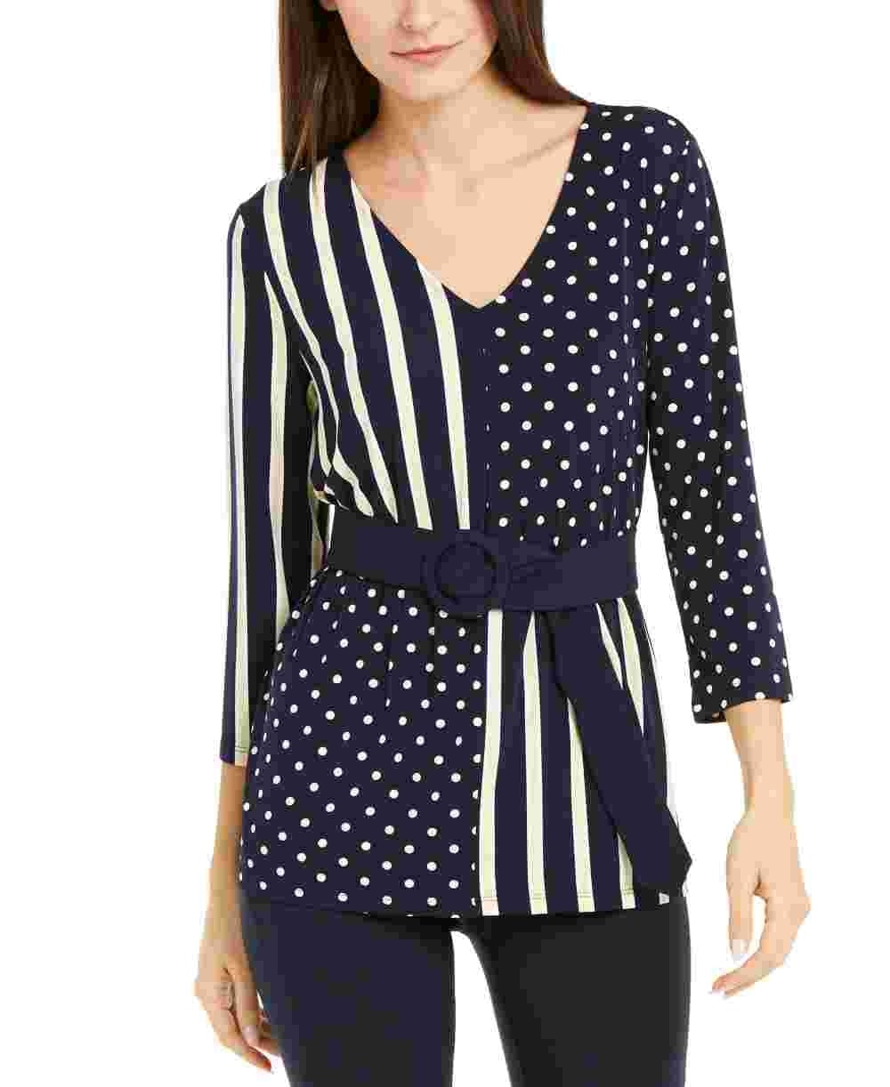 Alfani Women's Patterned 3/4 Sleeve V Neck Wear To Work Top Blue Size Medium