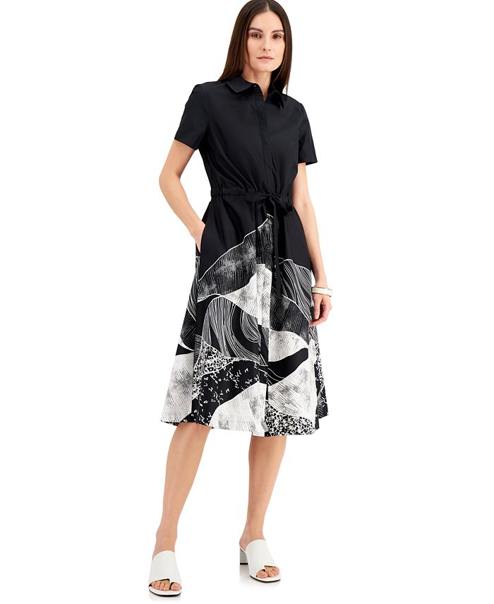 A printed skirt gives this Alfani midi shirtdress a stylish edge| freshening a timeless and versatile workday look.| Approx. 47 long from center back neck to hem| Fitted through the chest and waist; flared and flowing skirt| Point collar; fit & flare silhouette| Front button closure