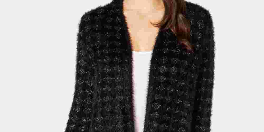 Alfani Women's Petite Eyelash-Yarn Cardigan Sweater Black Size Petite Large