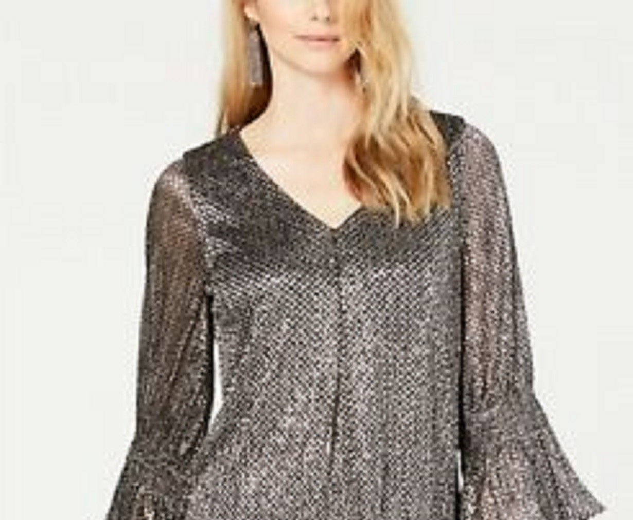 Approx. 23-3/8" long|Designed to fit and flatter 5'4" and under frame|V-neck|Allover metallic print|Sheer 3/4-sleeves with smocking at elbows|Nylon/polyester; lining: nylon
