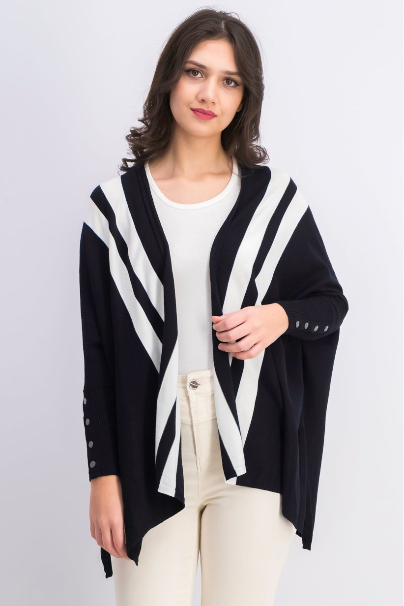 Approx. 26-1/2" long|Designed to fit and flatter 5'4" and under frame|Open front|Stripe details at front|Long sleeves with buttons at cuffs|Rayon/polyester