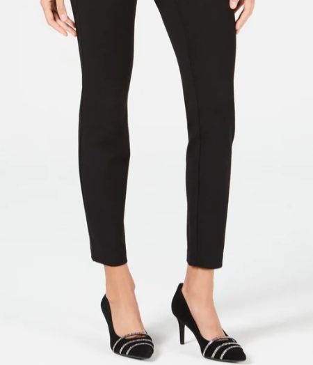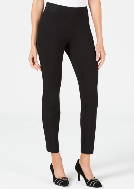 Approx. inseam: 27"|Mid rise; approx. front: 8"; approx. back: 15"|Designed to fit and flatter 5'4" and under frame|Pull-on; exposed elastic at waistband|Back welt pockets|Rayon/nylon/spandex