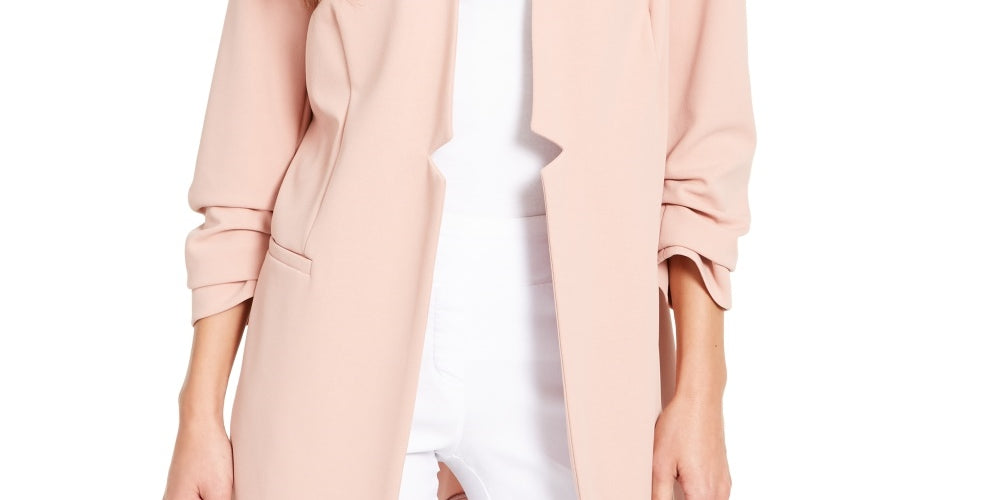 Approx. length: 32" from center back to hem|Collarless|Notch details at front|Welt pockets at hips|Ruched sleeves