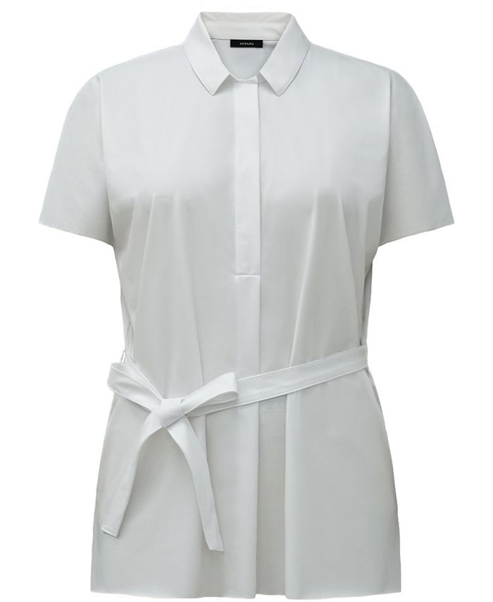 Create a custom fit and look with this Alfani top| a comfy knit piece with a tie belt that lets you change things up.| Approx. 28-3/8 long| Point collar; pullover styling| Tie belt at waist| | Nylon/spandex