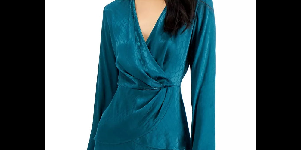 Approx. 25" long|V-neck; zipper closure at back|Long flared sleeves|Rayon|Machine washable