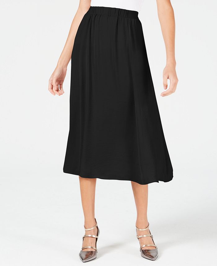 Soft material brings a flowing feel to Alfani's petite pull-on skirt in a classic A-line silhouette.| Midi length; approx. 28 long; A-line silhouette | Designed to fit and flatter 5'4 and under frame| Pull-on style| Lined|