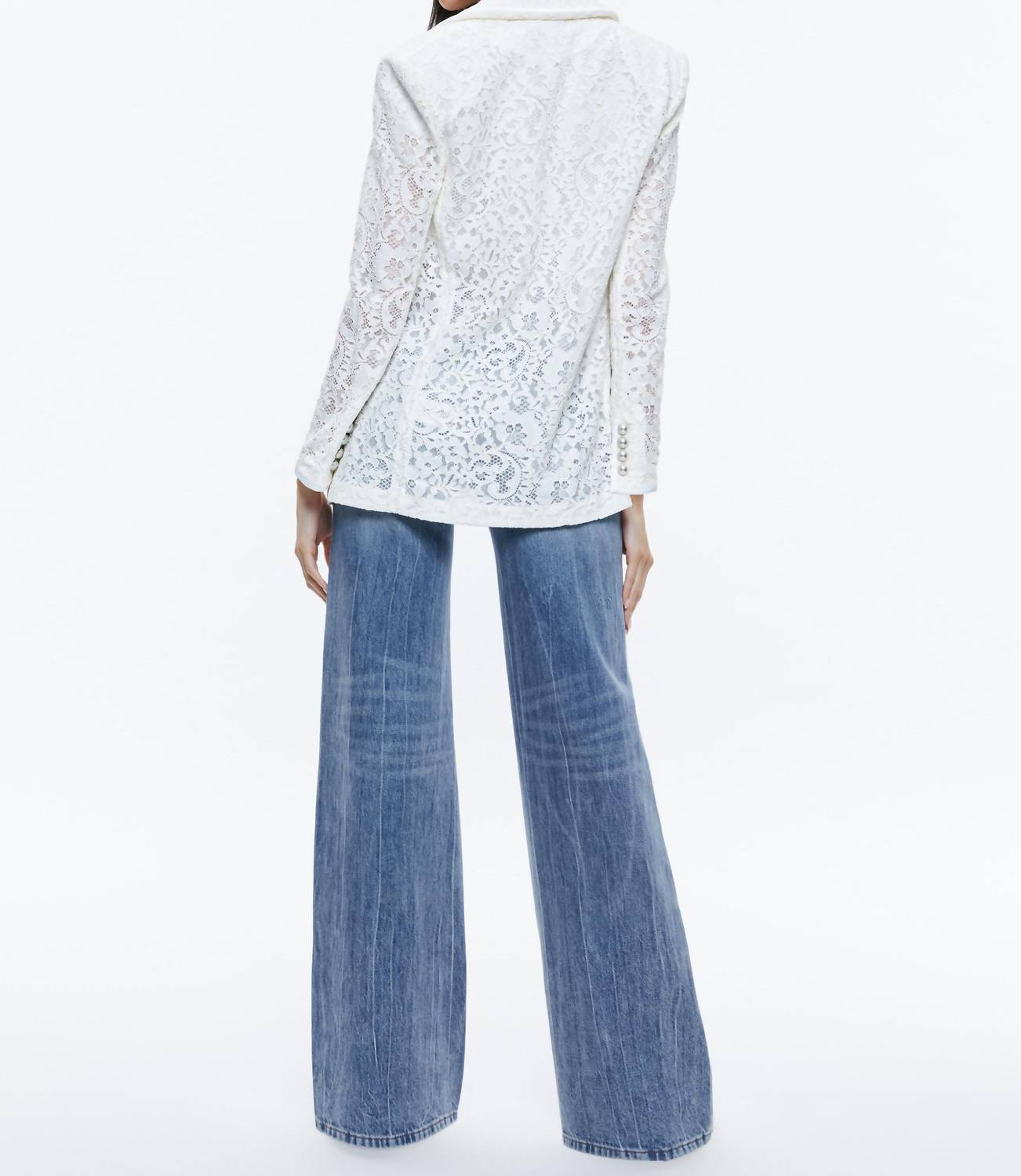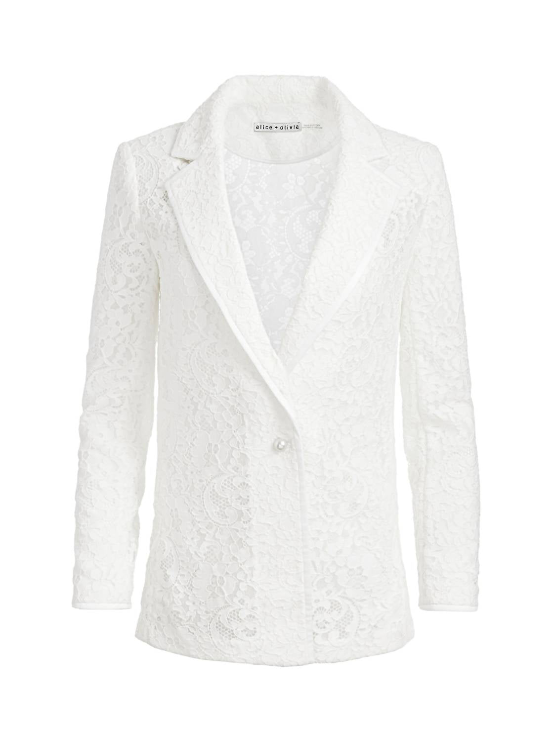 A blazer so versatile you can wear it to the office or pair it with jeans for a more casual look. Elevate your wardrobe with the Judith Sheer Lace Notch Blazer by alice + olivia, a refreshing take on the classic tux jacket in a delicate Off White hue. This piece features long sleeves, a graceful notch collar, and is meticulously crafted from a blend of 90% nylon and 10% elastane. The jacket has a total length of 28.5 inches, is imported, and boasts a sophisticated pearl button closure, along with shoulder pads that add structure. For care, it requires dry cleaning to maintain its exquisite design. The model is 5'10" with a 32” bust, 23” waist, and 34” hips, wearing a size 2 that fits true to size.