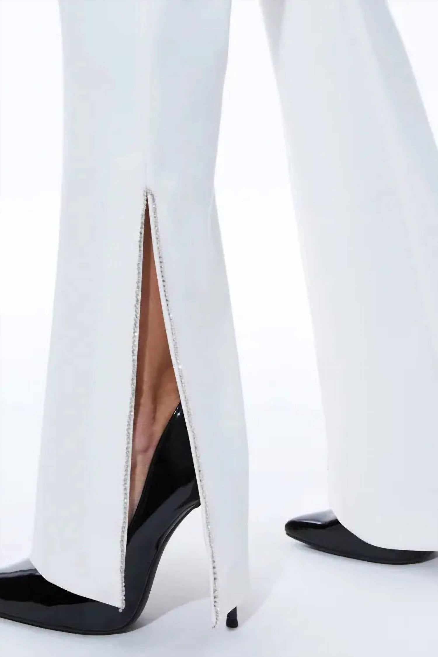 Slightly flared pants are all the rage right now and these are no exception. Pair these with your favorite tee for a more casual look, or with your favorite button-up blouse for an evening out. Introducing the Lara Side Slit Pants by alice + olivia, a stylish addition to your wardrobe in elegant Ecru. These mid-rise, flared leg trousers feature a clean waistband and a side slit with embellished trim, combining comfort with a modern aesthetic. Made from twill sateen composed of 64% polyester, 32% viscose, and 4% elastane, they promise a flattering fit with a touch of stretch. Closure is via a discreet side zipper, and they should be dry cleaned only to maintain their pristine look.