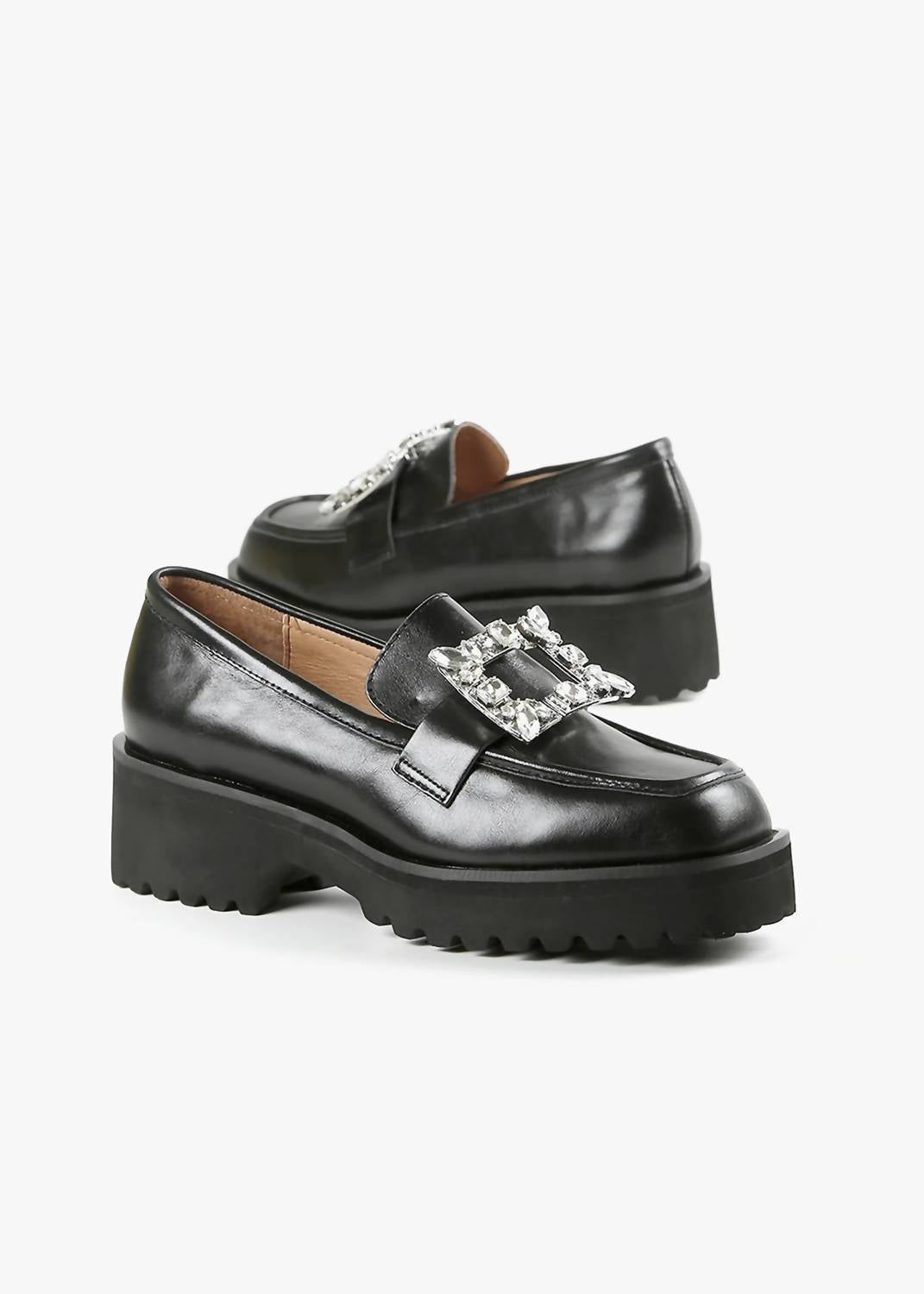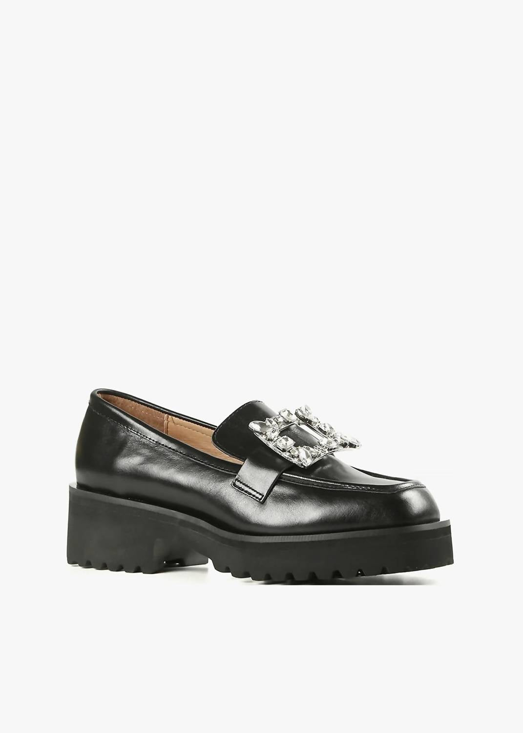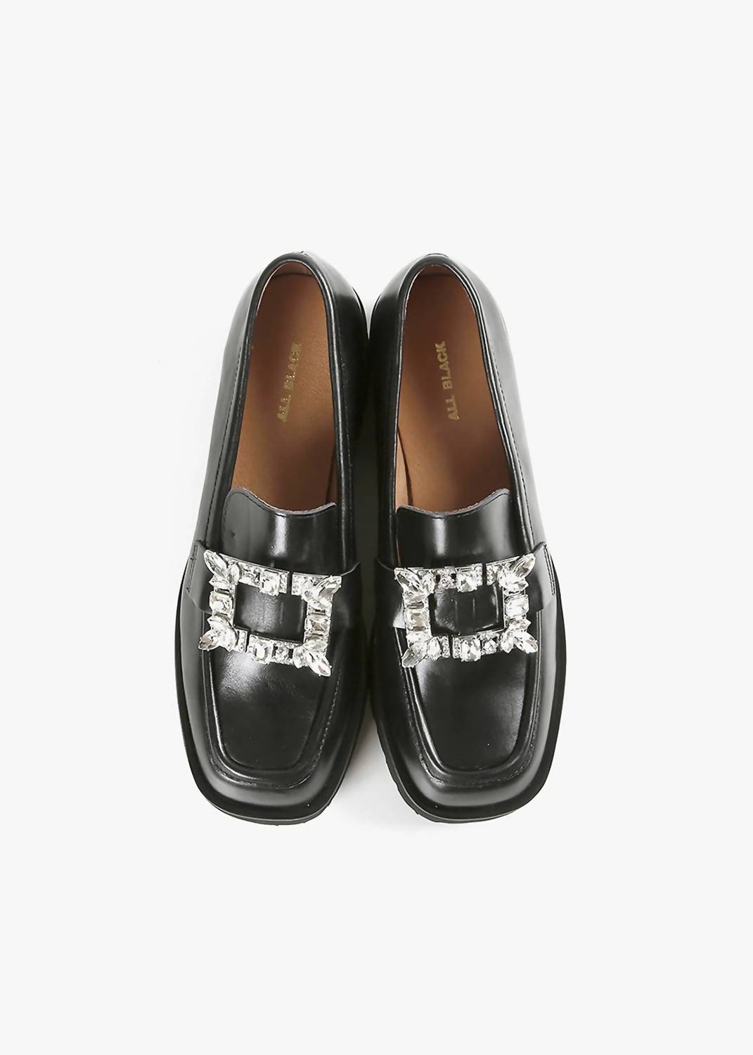A classic loafer that is both comfortable and polished. All Black introduces the Women's Elton Lugg Loafer in sophisticated black, offering both style and comfort. This loafer boasts a leather upper with a striking large rhinestone buckle for a touch of glam, and has a slip-on design. With a 2-inch chunky heel and a squared toe, it's perfect for leisurely strolls or stylish outings. Made in China, this piece features a lightly cushioned footbed and a durable lug outsole for reliable support and traction.