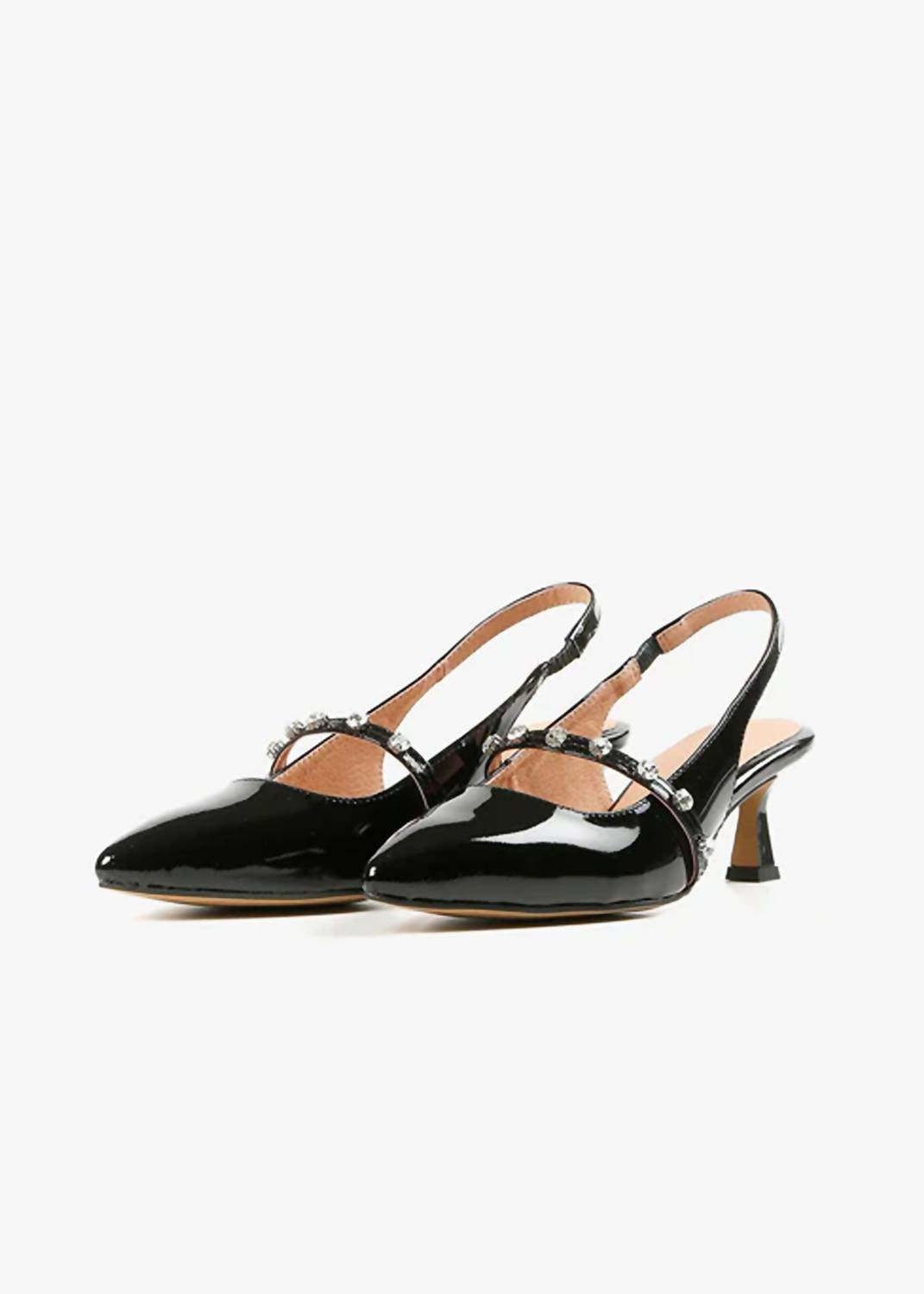 Don't be deceived, these heels are comfy as can be. Step into elegance with the Tiffany Princess Sling Back Heel by ALL BLACK, a sophisticated choice for the modern woman. Featuring a patent leather upper for a polished look, this heel has a pointed toe and a spool heel, ideal for spring. The interior combines a pig skin lining and insole for comfort, while a durable rubber outsole ensures all-day wearability. This sleek black patent design effortlessly elevates any outfit.
