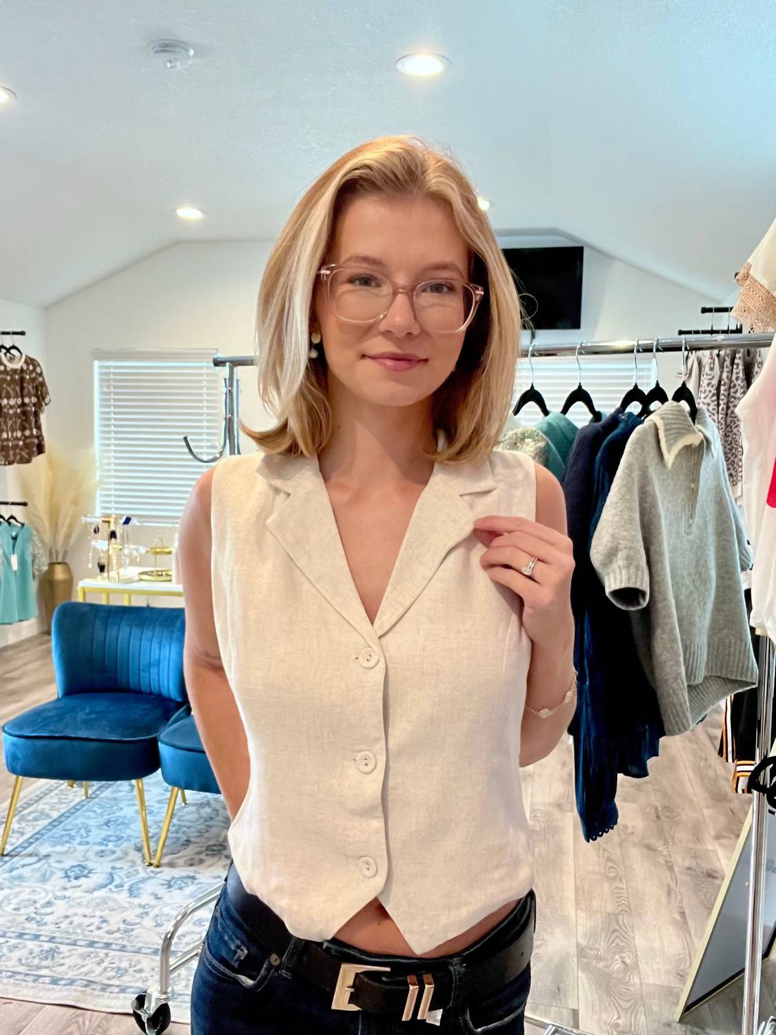 Introducing the Amelia Vest by ALLIE ROSE, a chic and minimalist addition to your wardrobe. This sleeveless vest comes in a timeless white, crafted from soft linen for a structured yet comfortable fit. It features a sophisticated collar neck and a button closure, making it a versatile layering piece for both casual and polished looks. Whether styled with denim or wide-leg trousers, this solid-patterned vest exudes effortless confidence.