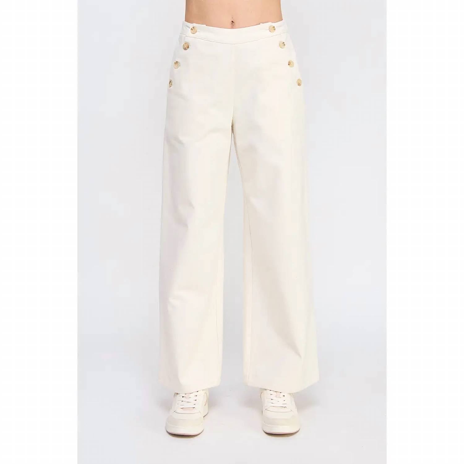 Introducing the Twill Side Button Wide Leg Pants from Allie Rose in a sophisticated cream color, perfect for adding a touch of elegance to your wardrobe. These high-rise pants feature a relaxed fit and a wide-leg style, made from 100% cotton with a comfortable stretch for all-day wear. Closure type: Pull-on design with practical pockets. Care: Machine wash cold, inside out, and tumble dry low.