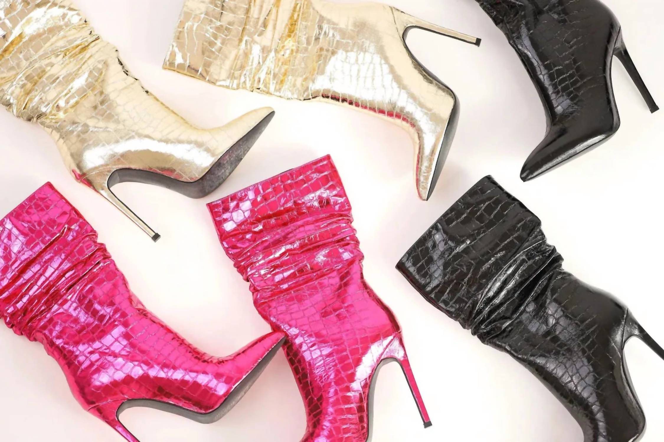 Upgrade your shoe game with these classic heeled boots, designed to merge sophistication and style. Comfortable enough for long days or a night out on the town. Step into luxury with the 90210 Boots by Allison Avery, crafted in a striking metallic snakeskin leather furnish. These gold stiletto-heeled boots feature a mid heel height of 3 inches, coupled with a pointed toe for a sharp, sophisticated look. Ideal for women looking to make a statement, they come with a dust bag and branded shoe box for safe storage.