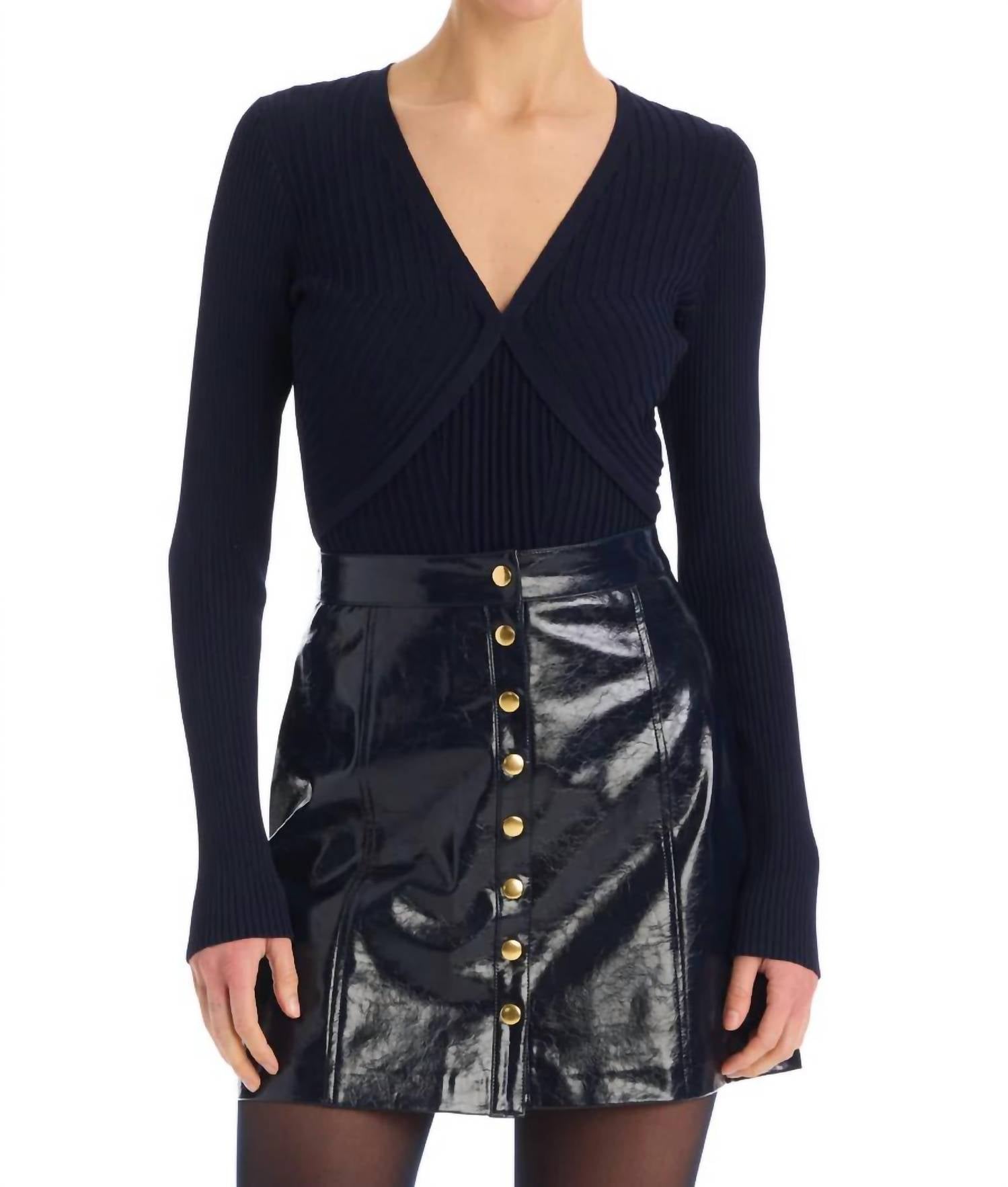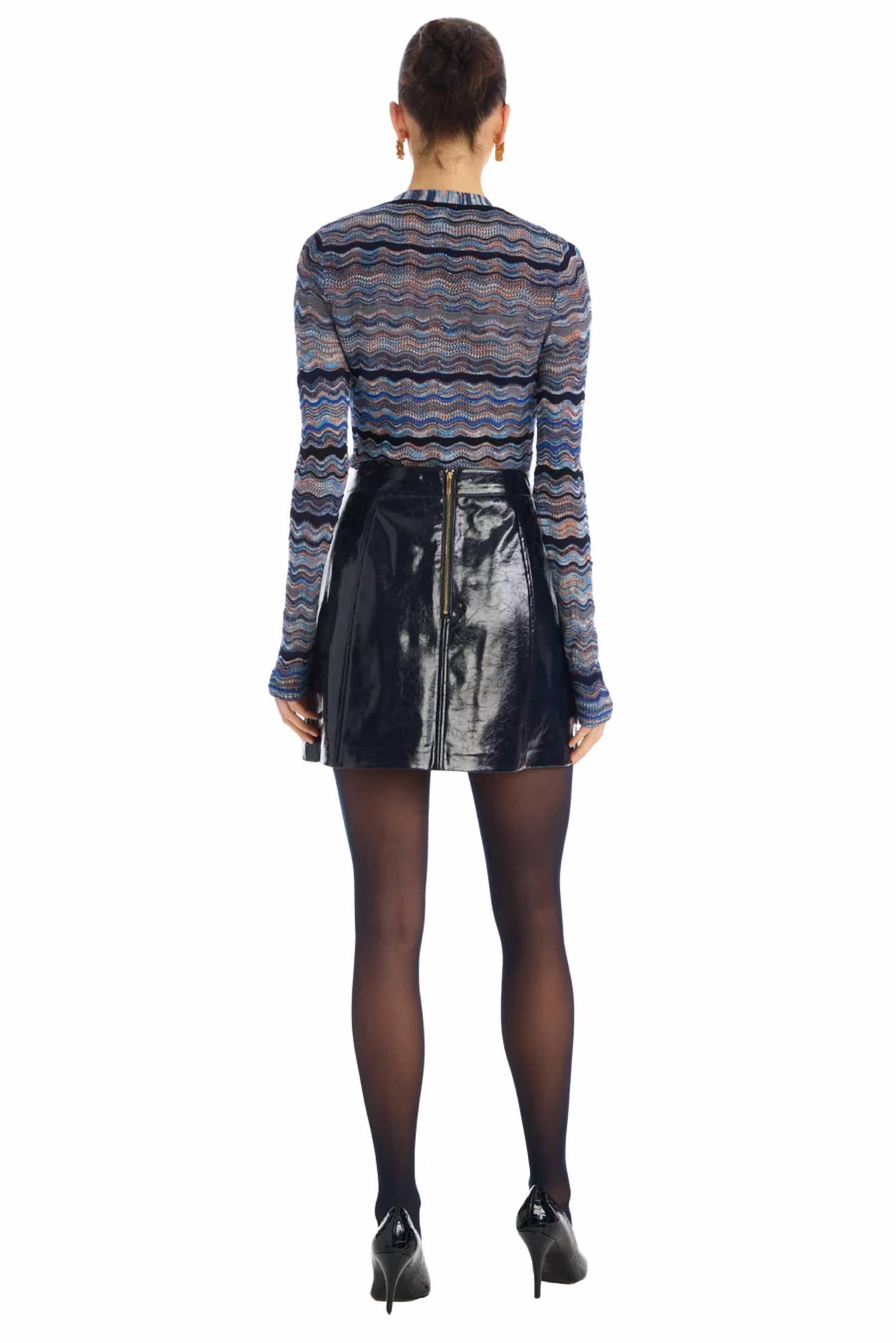 Tuck in your favorite tee for a more laid-back vibe. The Carla Skirt features a shiny faux leather with gold buttons down the center front. Fitted through the waist and high hip with an A line shape. Fully lined with a center back zipper closure in gold.