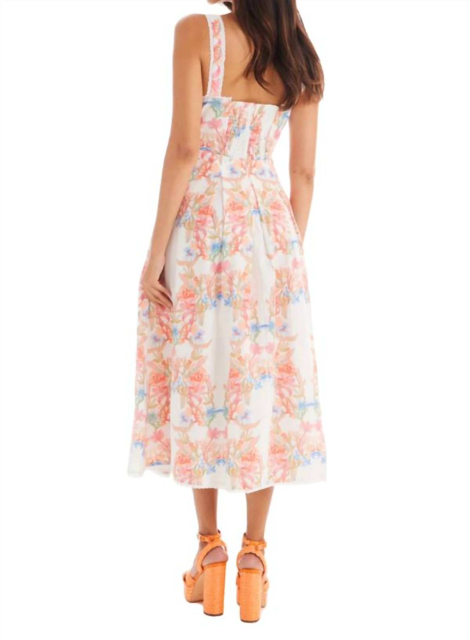 Introducing the Juliana Midi Dress by ALLISON NEW YORK, a stunning piece perfect for everything from garden parties to tropical vacations. This sleeveless dress is crafted from a Cotton Blend and features a chic floral arches print with a square neckline and wide straps for a fitted, feminine silhouette. Designed with an A-line style, the pleated full skirt is fully lined for comfort and finished with a convenient zip closure at the center back. Keep your look soft and summery with heels and delicate jewelry. Care instructions: Hand wash and lay flat to dry. Model is 5'9" and is wearing a size small.