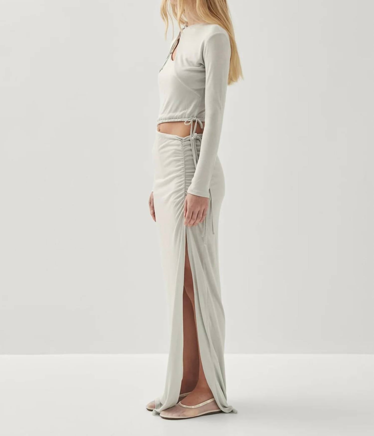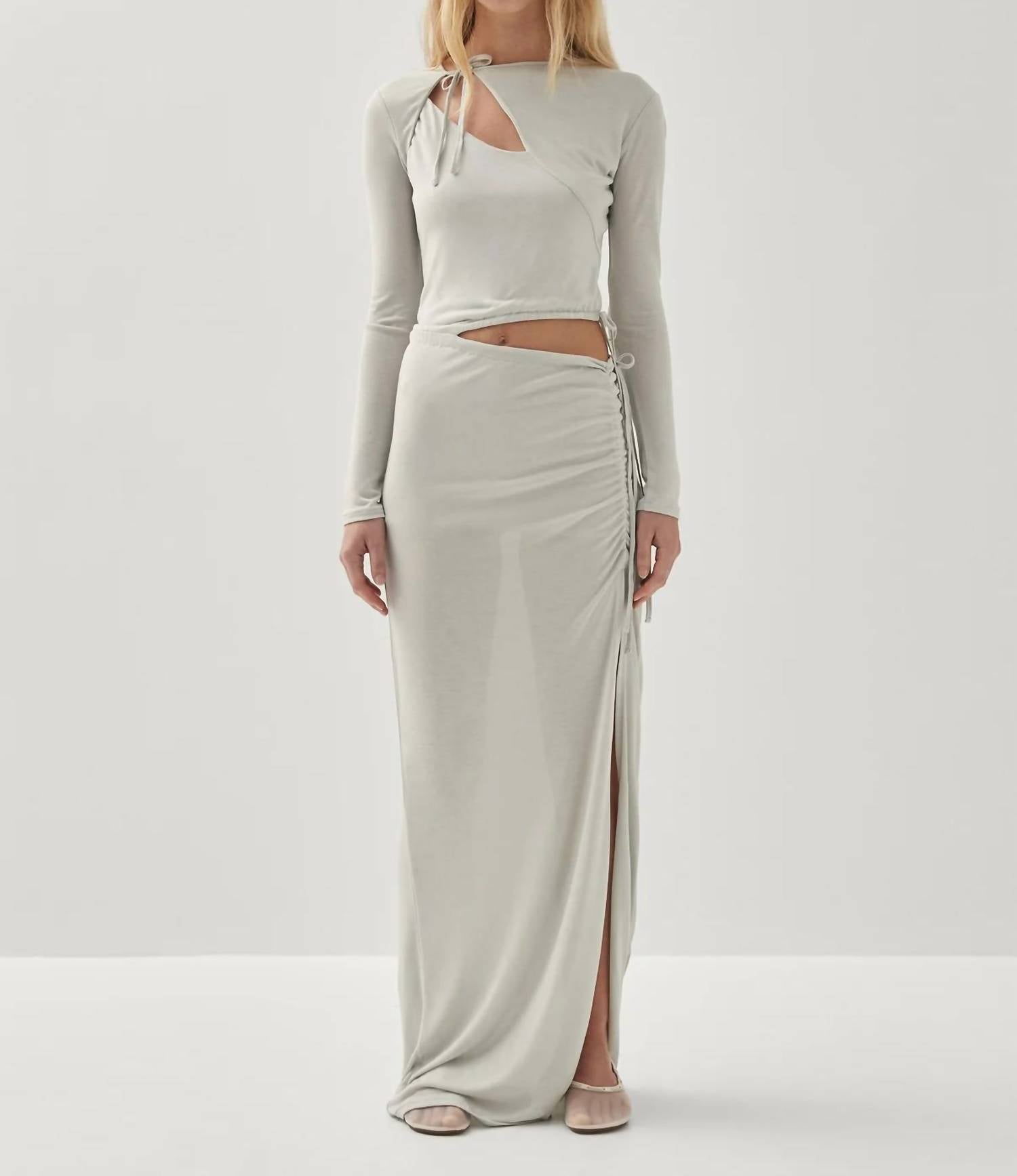 Show off just the right amount of skin in this adorable assymetrical dress. Elevate your style with the Doi Maxi Dress by ALOHAS, a sleek and minimalist piece in a stunning grey shade. Featuring long sleeves and a bodycon silhouette, this fitted maxi dress includes chic cutouts at the shoulder to chest and waist. The asymmetrical design is complemented by a side slit adorned with a bow-tie closure, adding an elegant touch. Perfect for springtime occasions, this dress embodies a sophisticated and modern aesthetic.