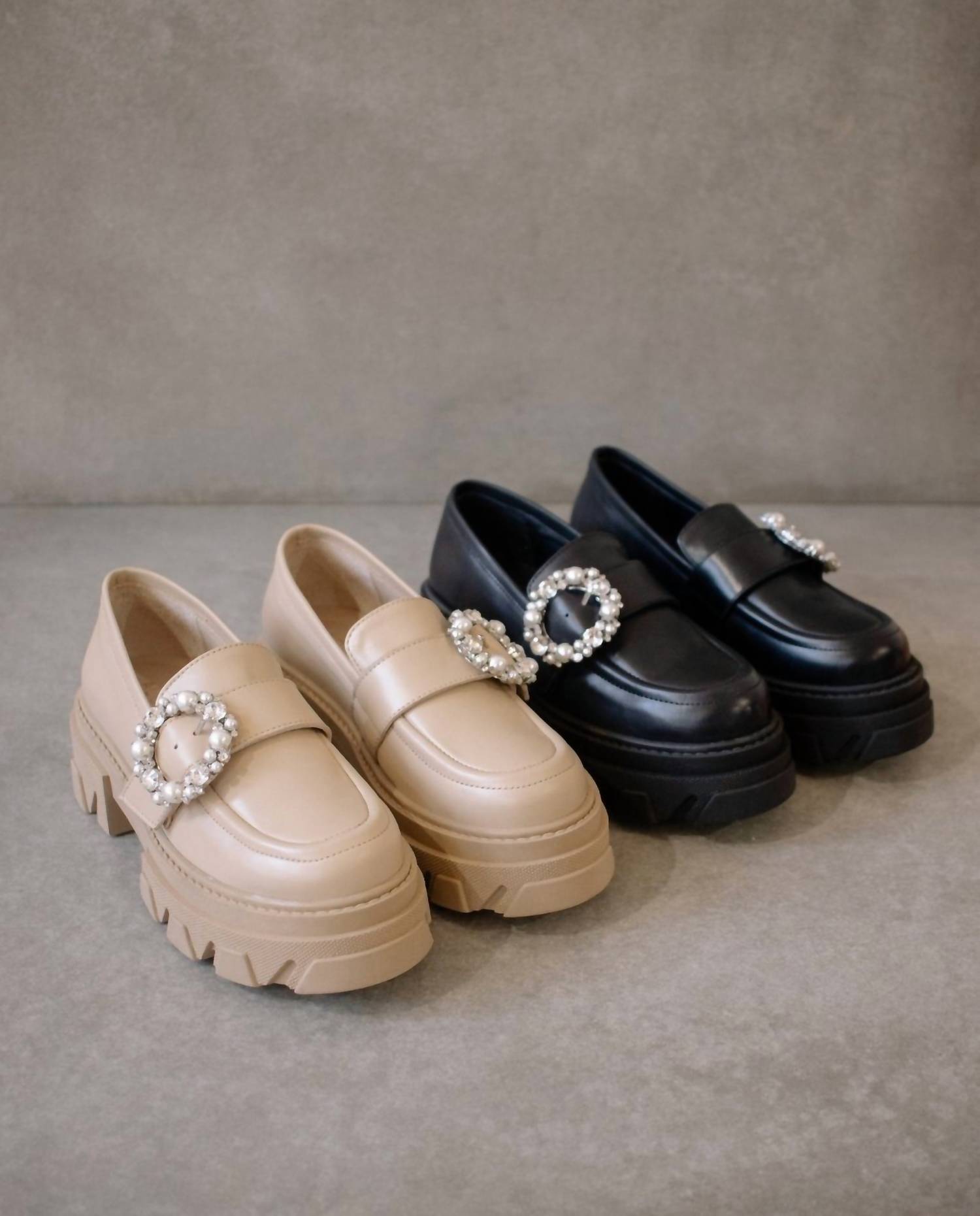 A classic loafer that is both comfortable and polished. This Trailblazer is a leather chunky loafer featuring a crystal buckle. These leather loafers are made of sustainable black leather and set on cleated rubber soles that feel a touch more modern than your traditional moccasin style. Fit true to size, in-between sizes go up to next full size.