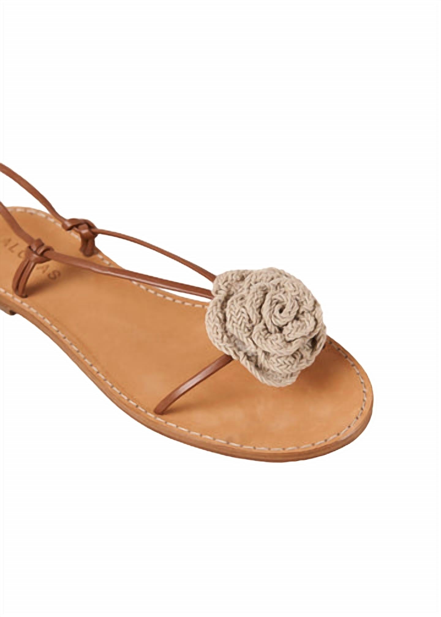 This sandal will take you from brunch to dinner and everything in between.The Jakara sandal could be considered simplistic if it weren’t for sizable crocheted blossoms, adding more than just a touch of charm. The soles, on the other hand, boast expertly hand-stitched detailing and subtle heels. Material: sustainable leather. Upper, lining, outsole: 100% cow leather. Embellishment: 100% cotton. Heel height: 1cm.