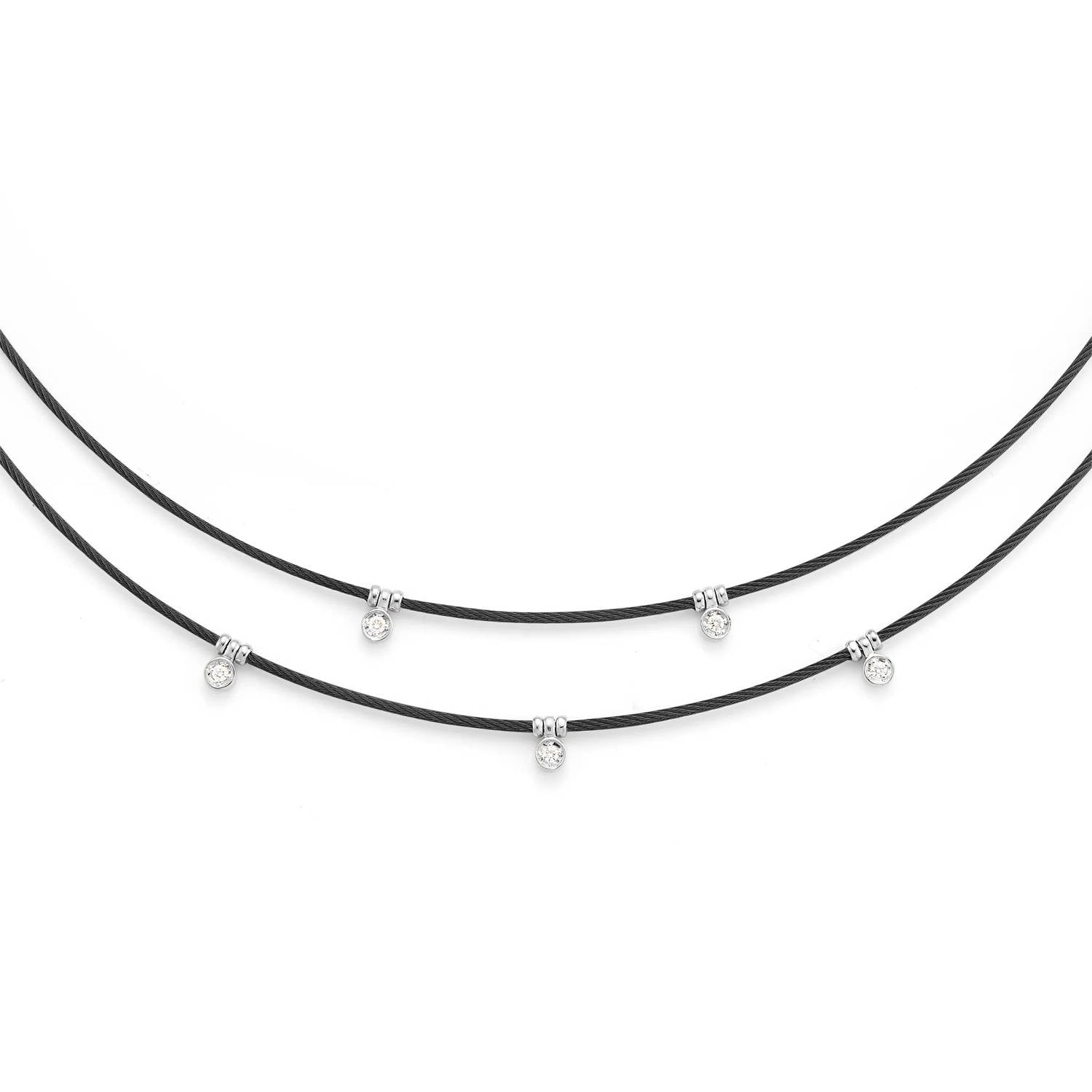 Both understated and impactful, you'll be reaching for this one-of-a-kind necklace season after season. Double-layered stainless steel cable adorned with diamond droplet stations. Luxurious piece combines 18k yellow gold elements with a total of 0.11 carats of diamonds for a sophisticated look. Measuring 16.5" in length, this necklace is a stunning addition to any jewelry collection, offering timeless elegance with a modern twist.