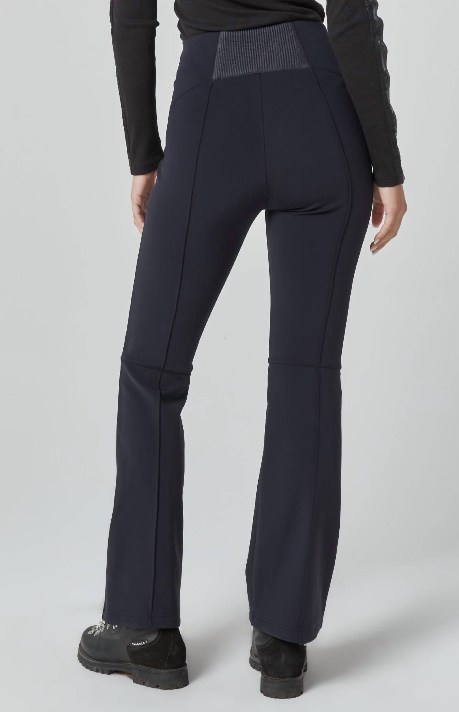 High-waisted with flared boot-cut leg. Zip fly closure. Zip pockets. Pintuck stitching along front and back for slimming effect. Articulation at knee for better range of motion. 4-way stretched softshell fabric bonded with microfleece inside for extra warmth. Water and wind repellant. Heat retention. Materials: 43% Polyester/43% Nylon/14% Spandex. Machine wash. True to size. Model is 5'10.5" wearing a US size S. Measurements (size S): 31.5", inseam, 11.25", front rise, 20" leg opening.