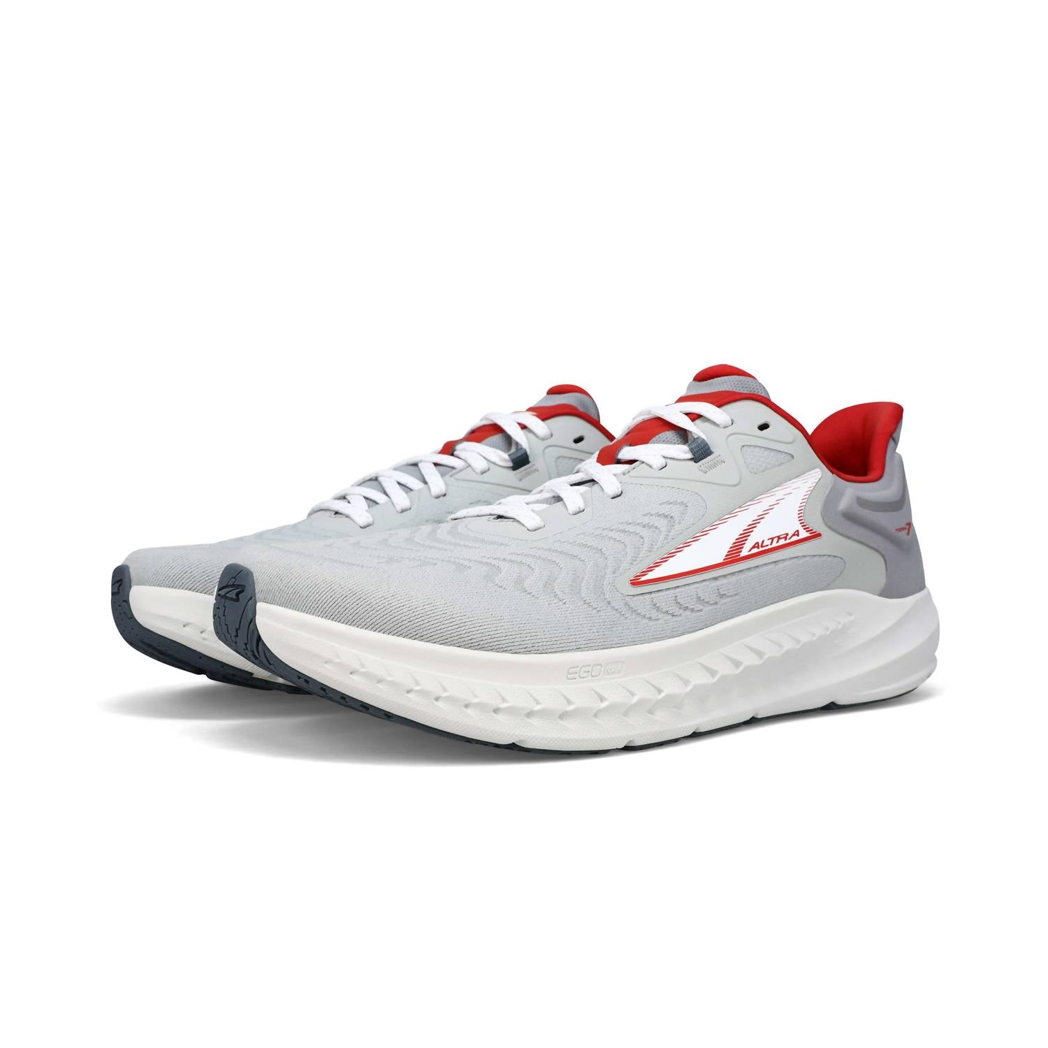Introducing the Men's Torin 7 Running Shoes by ALTRA in a dynamic Gray/Red colorway, designed to redefine your running experience. These shoes feature a high cushion with a 30mm stack height and a zero-millimeter heel-to-toe drop, delivering comfort and peak performance on any road. The engineered mesh upper ensures breathability, while the Altra EGO™ MAX foam midsole provides added bounce and plush feel. With a rubber outsole and a molded heel collar for security, these shoes offer natural movement and a perfect fit for athleisure occasions.