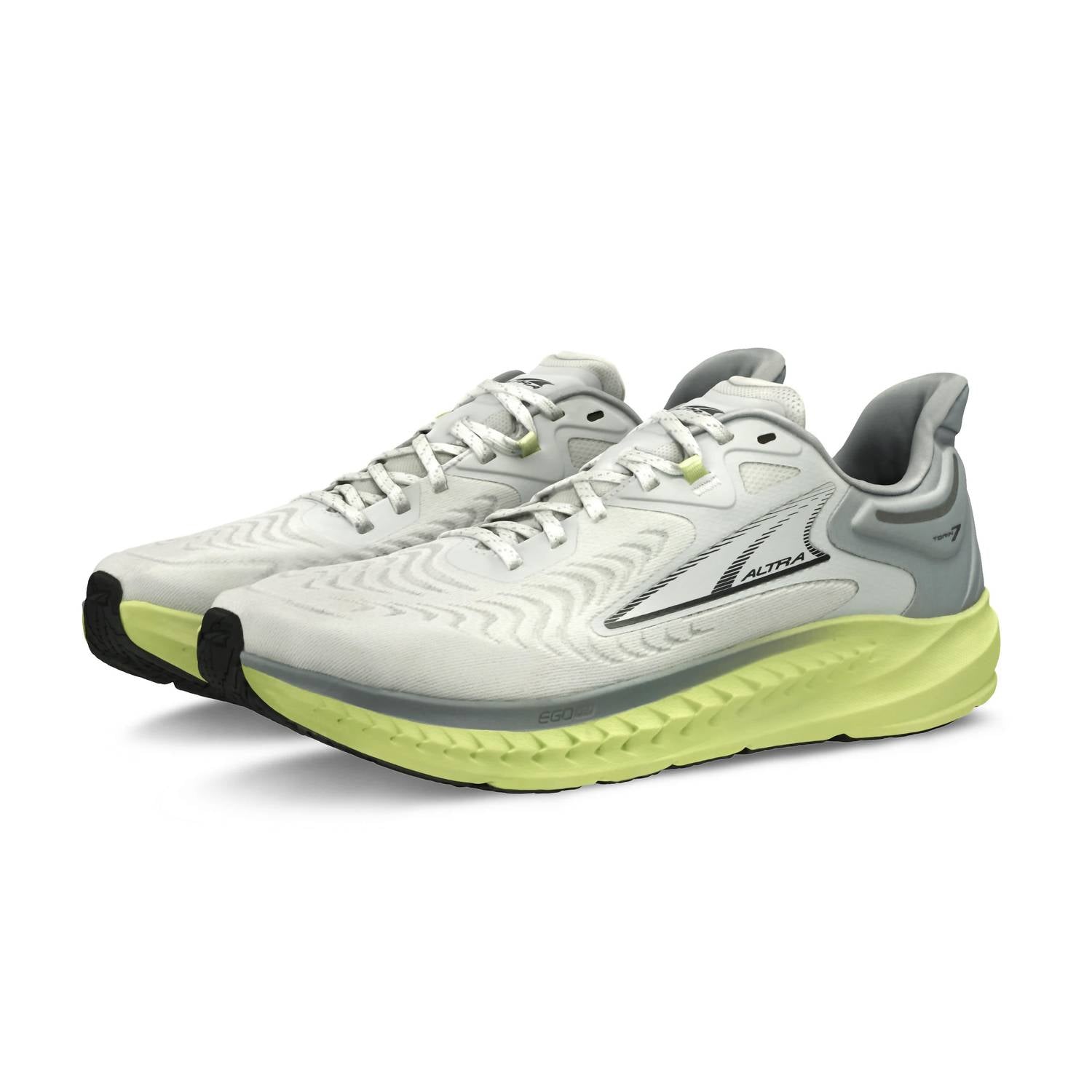 Introducing the ALTRA Men's Torin 7 Running Shoes in Gray/Green, the ultimate choice for road running and walking enthusiasts. Designed with a high cushion and zero heel-to-toe drop, this pair features a plush 30mm stack height for neutral support and natural movement. The engineered mesh upper offers unmatched breathability, while the Altra EGO™ MAX foam midsole adds an extra millimeter of bounce, ensuring peak comfort and performance. Weighing in at 9.8 oz (278 g), it provides a secure fit with a molded heel collar and medium width, making it perfect for any fitness or workout occasion.