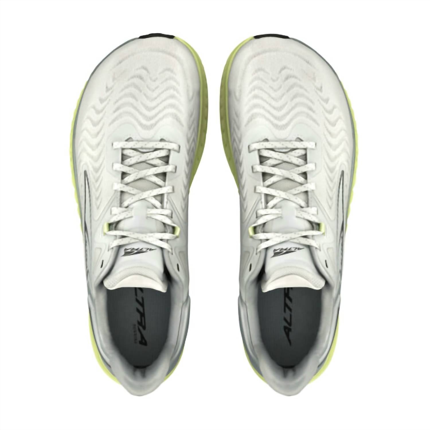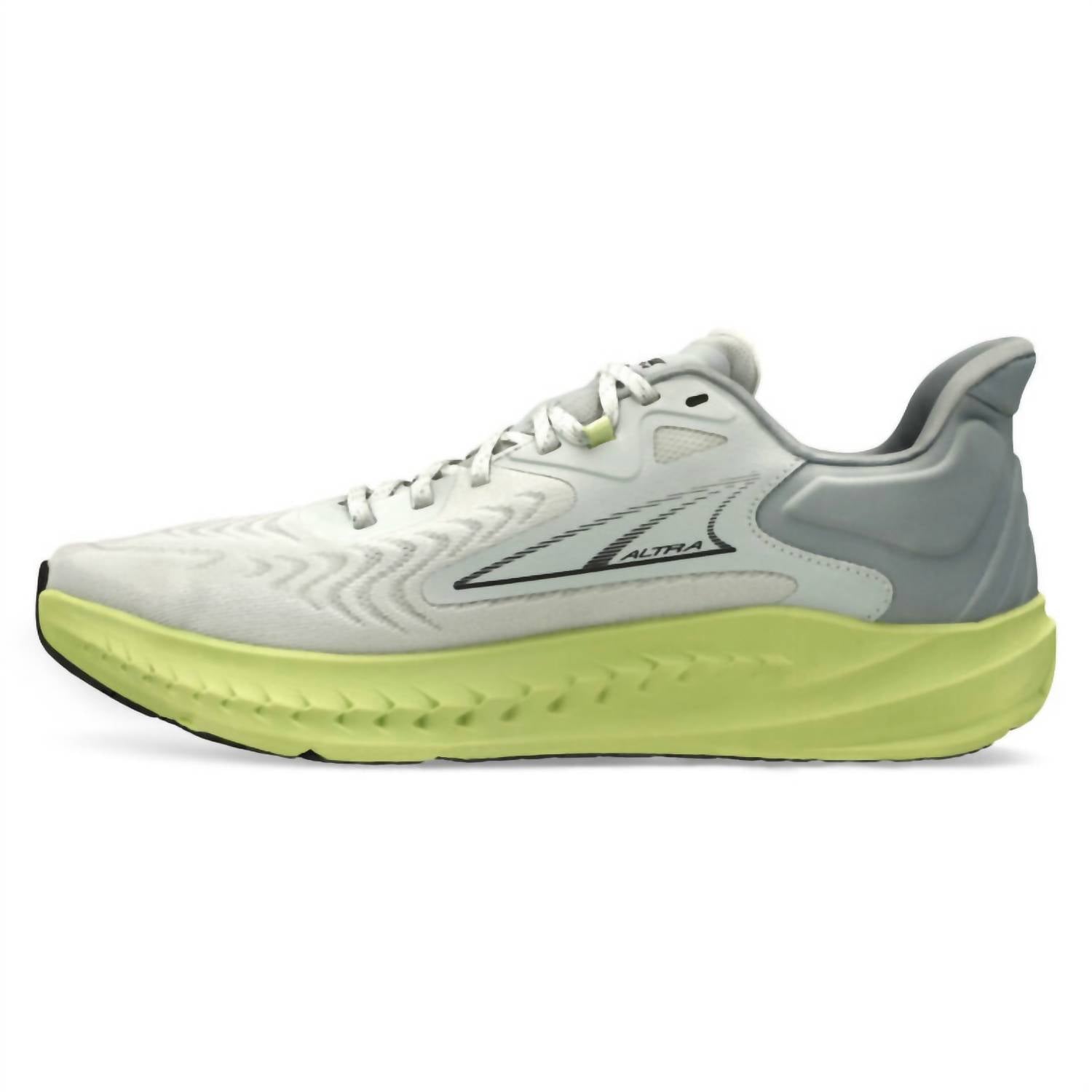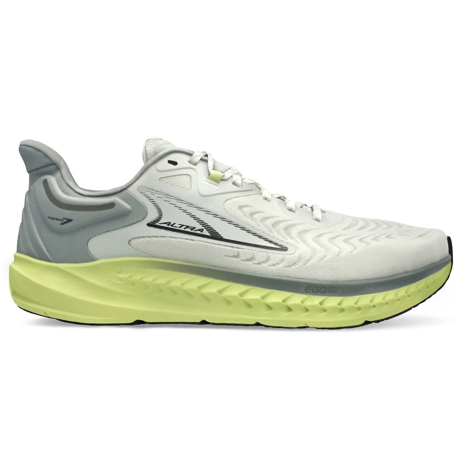 Step up your footwear game with the Men's Torin 7 Sneaker from ALTRA, featured in a sleek gray and green colorway. Designed with a medium shoe width and a round toe shape for a comfortable fit, these sneakers offer a low heel height of 1 1/4" to 2" to ensure optimal support. Crafted with durable rubber materials, these shoes are perfect for daily wear. Suitable for adult men, they effortlessly combine style and functionality.