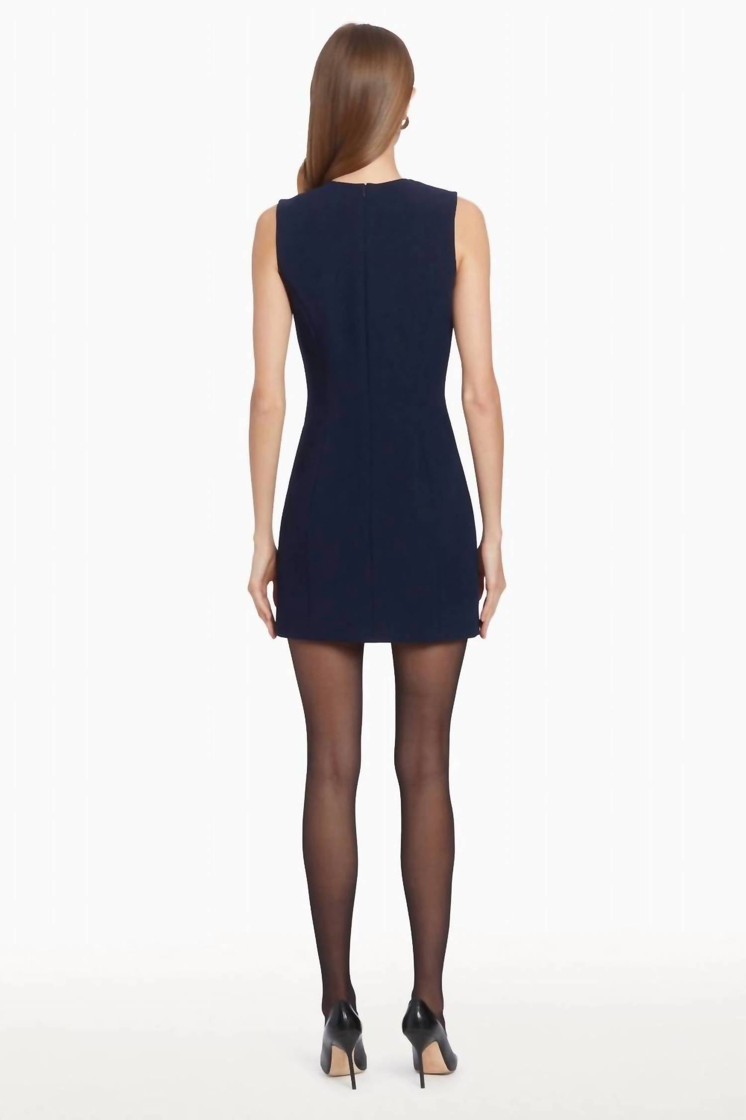 The kind of easy and flattering dress you'll be reaching for all season long. Step out with confidence in the Andie Mini Dress by Amanda Uprichard, a sophisticated piece for your evening occasions. This sleeveless bodycon dress in navy showcases curved leather piping on the front, adding a contemporary twist to a classic silhouette. Crafted from 75% Polyester, 19% Viscose, and 6% Elastane, with a 100% Polyurethane combo and 100% Polyester lining, ensuring a comfortable fit and chic appearance. Perfect for fall, this dress pairs beautifully with tights and ankle boots or a statement jacket for cooler evenings.