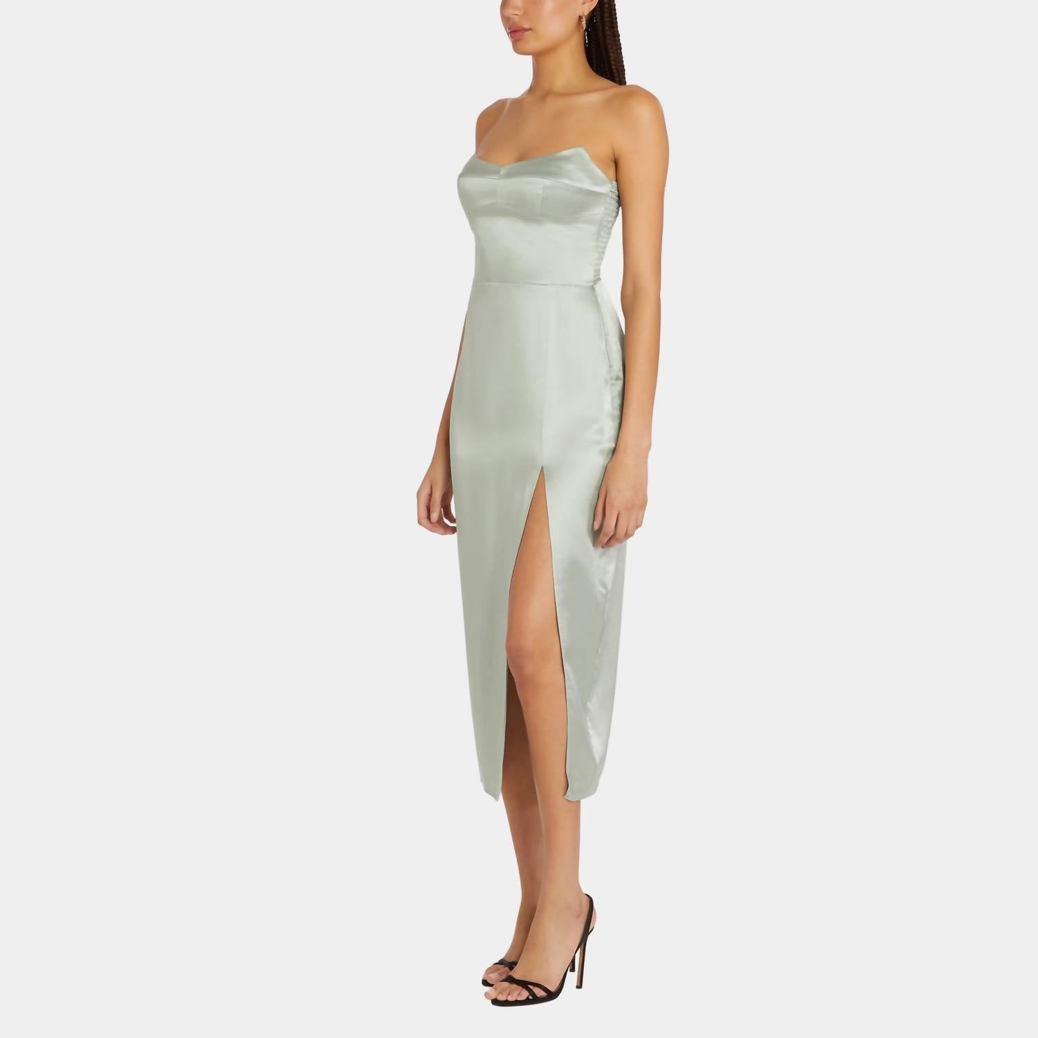 A strapless dress so versatile you can dress it up with heels or wedges, or give off a more casual vibe with flats. Introducing the Ivy Dress by Amanda Uprichard, a strapless sheath style in sophisticated Sea Salt. This 43-inch midi dress made from 100% silk features a soft V-neck and an invisible zip closure for a streamlined silhouette. It showcases pointed detailing at the bodice and a daring slit, enhanced by boning at the side seams for structure and smocking at the back for comfortable stretch. Care for this exquisite piece with dry cleaning only, and enjoy its chic allure for any special occasion.
