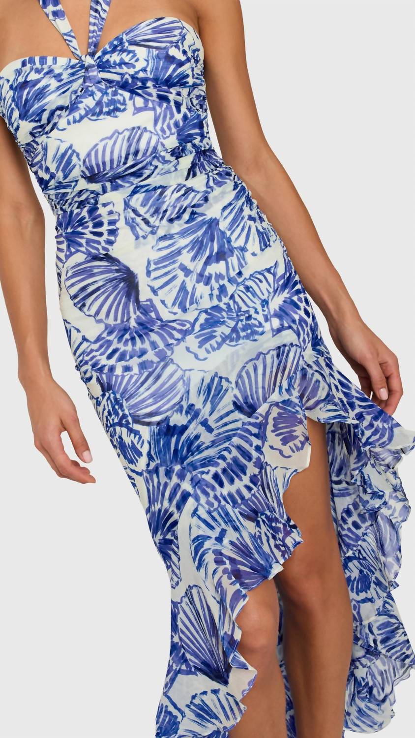 A cool twist on a classic style dress. Experience the allure of Amanda Uprichard's Marabou Chiffon Dress, exemplifying Boho Chic with a sleeveless halter neckline and crafted from 100% viscose. This fit-and-flare midi dress boasts a draped bodice, smocking at the back for comfort, and a zipper at the center back. Perfect for summer occasions, it features a high-low hem in a captivating shell print. Care: Dry clean only.